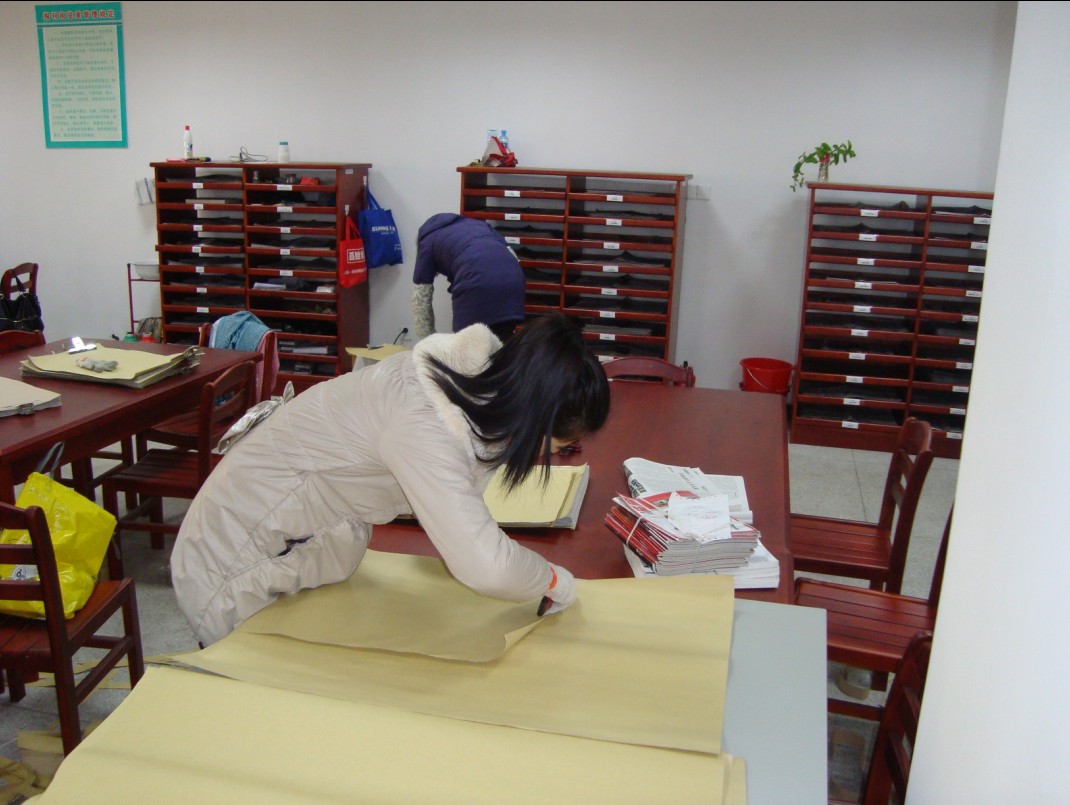 现在,报刊阅览室正在对年度报纸和期刊做集中装订工作。