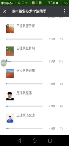 本次评选从12月初开始启动,前期对全院八支训练队推选的16名运动员及在运动会上表现突出的4名运动员共20人,体育部制作展板在运动场橱窗公示,同时把20位候选人的情况以微信图片的形式推送到学院微信公众平台,供同学们了解,特别是在微信投票环节得到了全院广大同学的广泛参与,在一个星期的投票时间段共有来自全院6348名同学参与投票。其中田径队邵启泰同学以1005票成为本次票选的票王,一时间,这些在各条战线为学员争金夺银的运动员变成校园的小明星,成为广大同学们心目中的英雄和模仿对象。