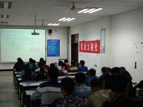 太极拳是中华传统武术的精华,被称为“国粹”。为了宣传太极文化,向全院同学推广太极拳。在指导老师的关心与指导下,乾清太极社在2016年4月8号中午4102教室举办了太极文化宣传活动。