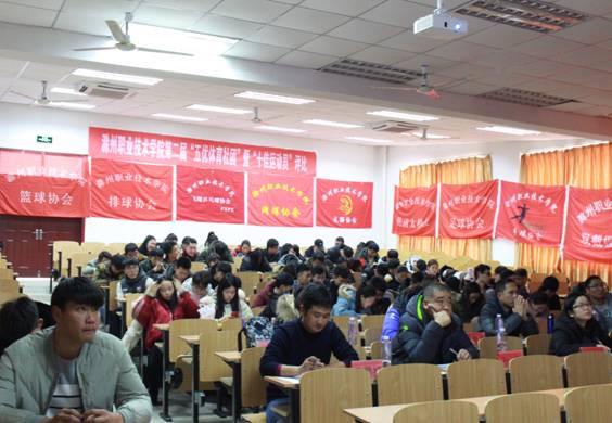 评选会上,七个入围年度优秀体育社团的会长们分别就本社团一年来的工作开展情况做了ppt汇报,展示了各个协会一年来取得的成绩、工作的亮点和存在的不足。汇报结束,团委程书记做了精彩的点评,程书记在点评中对各体育协会一年来的辛苦付出表示感谢,对大家取得的成绩表示祝贺,同时也就各体育社团在平时工作运行、活动开展、资料收集等方面提出指导性建议。体育部孙强主任做了总结发言,孙主任充分肯定了我院大学生体育协会成立两年来所取得的成果和为推动我院各项体育事业所做的贡献,同时就体育类社团下一阶段的发展提了几点意见:一、考虑各单项体育社团与体育课挂钩,课内外一体化发展,深化体育课俱乐部制模式。二、有条件的社团率先推进项目分级联赛,实行升降级制,让更多的同学参与到体育锻炼中来。三、在开展活动的形式上大胆突破,立足本校、服务社会,增强体育协会的社会影响力,扩大参与面,构建浓厚的校园“体育文化”氛围。