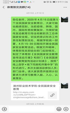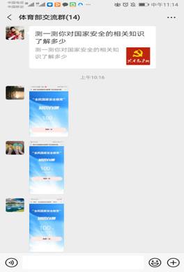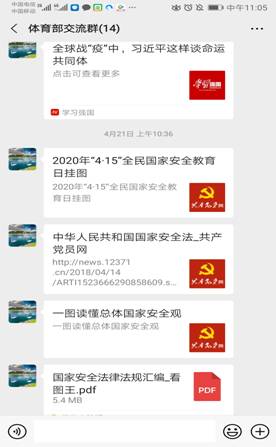 为深入贯彻《教育部办公厅关于组织开展2020年全民国家安全教育日宣传教育活动的通知》(教思政厅函〔2020〕4号)和《安徽省教育厅关于组织开展2020年全民国家安全教育日宣传教育活动的通知》(皖教秘思政〔2020〕20号)的文件要求,落实校党委《关于组织开展2020年全民国家安全教育日宣传教育活动的通知》统一部署,结合awc官网疫情防控和部门工作实际,4月15-30日,体育教学部由党支部牵头组织部门全体教职工采用“线上线下相结合”的方式,灵活运用部门网站、微信群、QQ群、学习强国等媒介,广泛宣传《中华人民共和国国家安全法》、《全国全民安全教育》等国家安全法律法规,营造“国家安全、人人有责”的浓厚氛围,力戒形式主义,坚决防止走形式、走过场,严格保密纪律,严防失密事件发生,切实将校党委通知精神落实到实处。