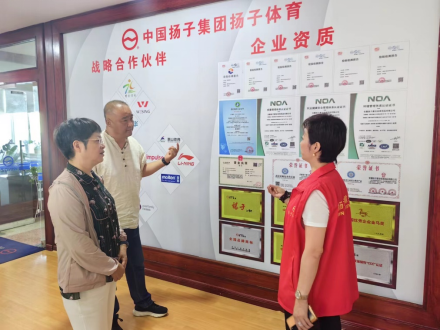 杨子嘉宝体育用品有限公司董事长赵文娟热情接待了调研组一行,调研组一行先后参观了维保合作案例展板区和体育器材展区,江洁详细了解了企业体育器材售后维保方面的资质和相关案例实施情况。