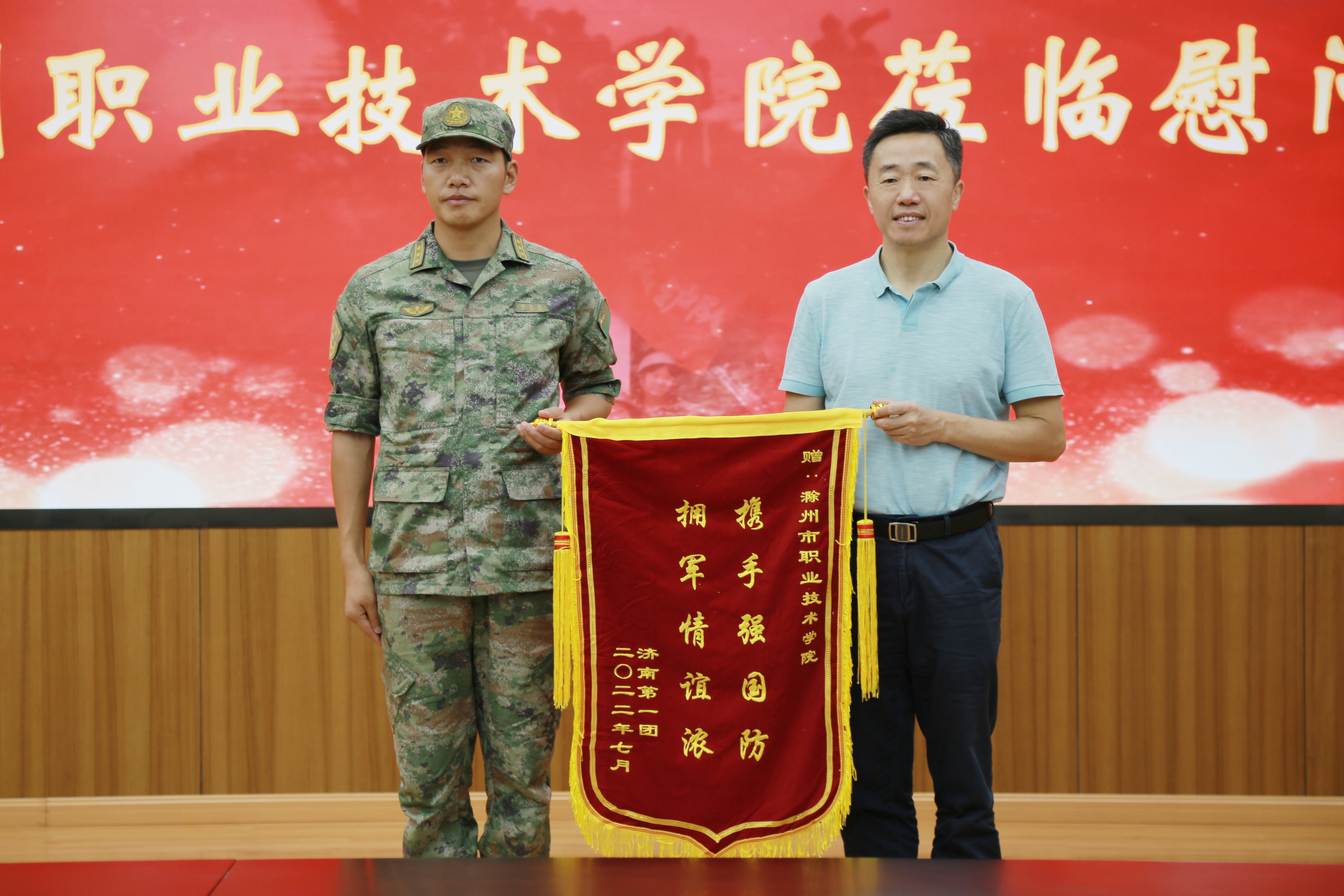 随后,杨家庆代表学校向部队送上节日慰问品,部队首长回赠了“携手强国防 拥军情谊浓”锦旗。
