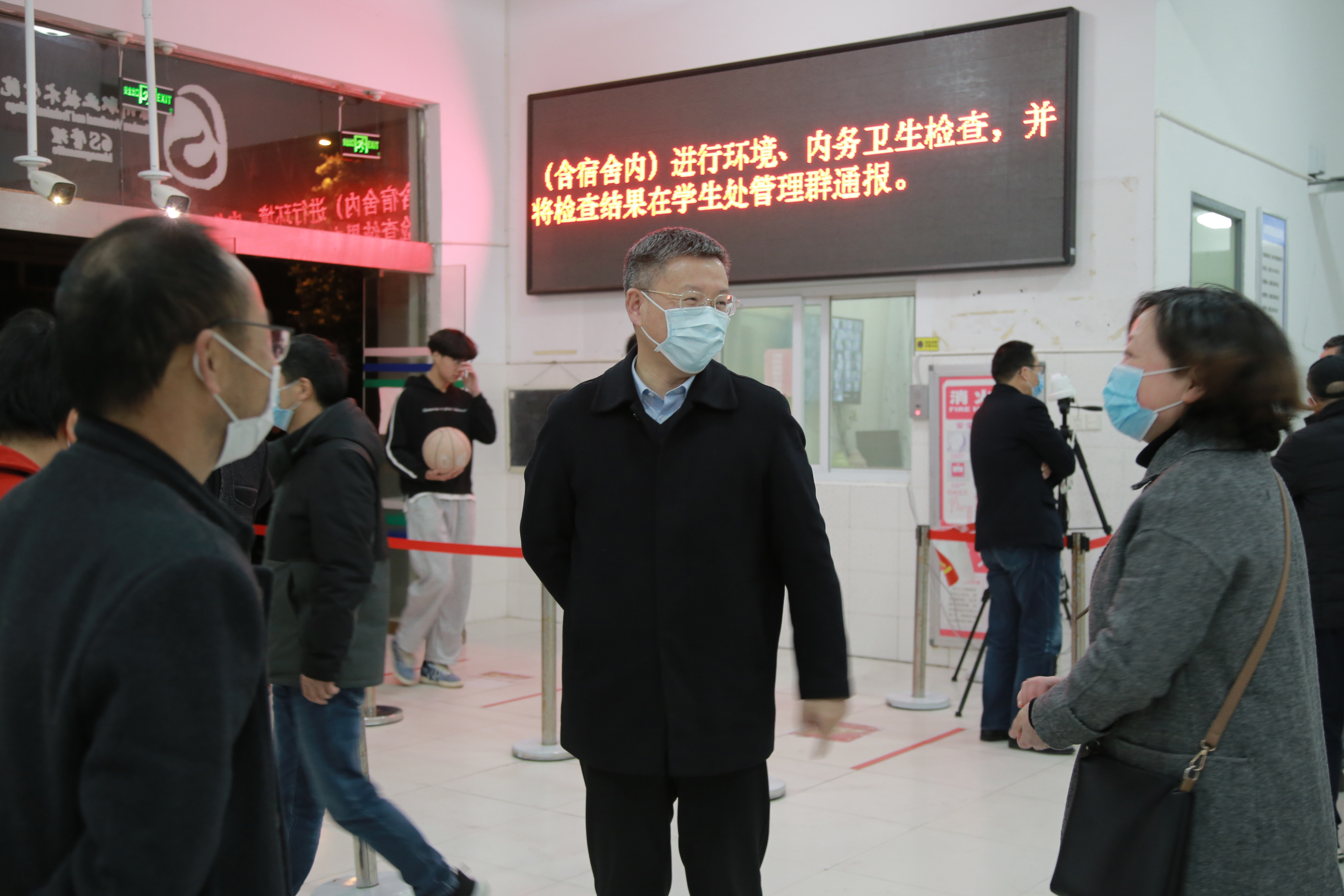 在宿管区,曹付忠叮嘱有关人员要严格执行校园封闭管理的各项规定,重点做好宿舍楼入口体温检测、公共区域卫生安全和消毒通风等工作。