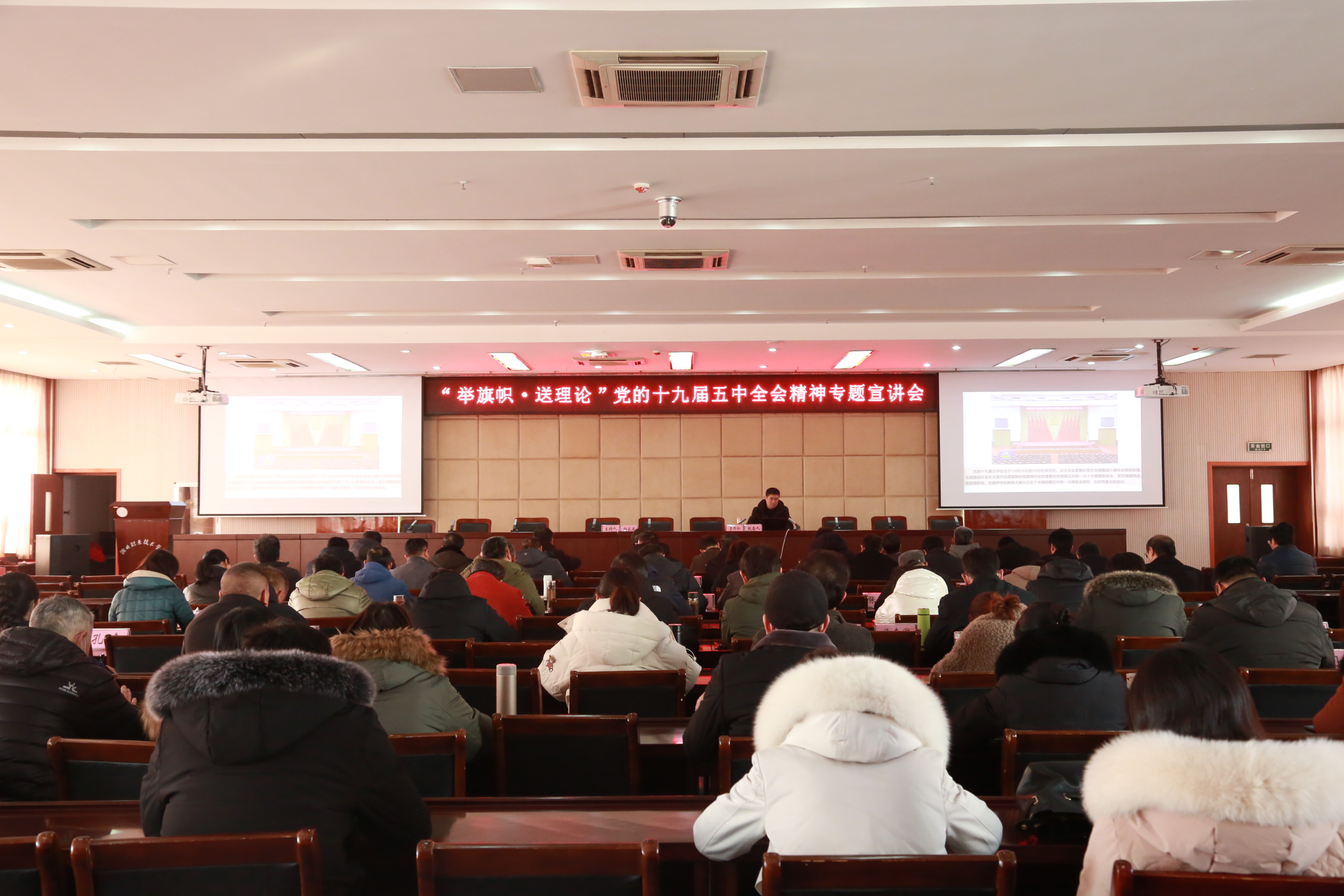 1月12日,学校在综合楼五楼学术报告厅召开党委理论学习中心组(扩大)学习会议暨“举旗帜·送理论”党的十九届五中全会精神专题宣讲会。滁州市委党校马克思主义基本理论教研室主任李邦松副教授参加会议,并作党的十九届五中全会精神专题宣讲。党委书记李柱梁,党委副书记、校长许雪峰,党委副书记杨家庆,校领导杨华龙、江洁、汪上、陈学军、穆松、李平权,各教学院部党政正副职,各部门正副职,马克思主义学院全体教师,全体专职辅导员参加会议。会议由杨家庆主持。 李邦松以“开启全面建设社会主义现代化国家新征程”为主题,从新阶段与新目标、新理念与新部署、新变化与新格局三个方面并结合习近平总书记在省部级主要领导干部学习贯彻党的十九届五中全会精神专题研讨班开班式上的重要讲话,详细梳理了党的十九届五中全会的召开背景、重大意义;决胜全面建成小康社会取得决定性成就;我国发展环境面临的深刻复杂变化;2035远景目标;“十四五”时期我国发展的指导方针、主要目标、重点任务;滁州市“十四五”发展目标等。