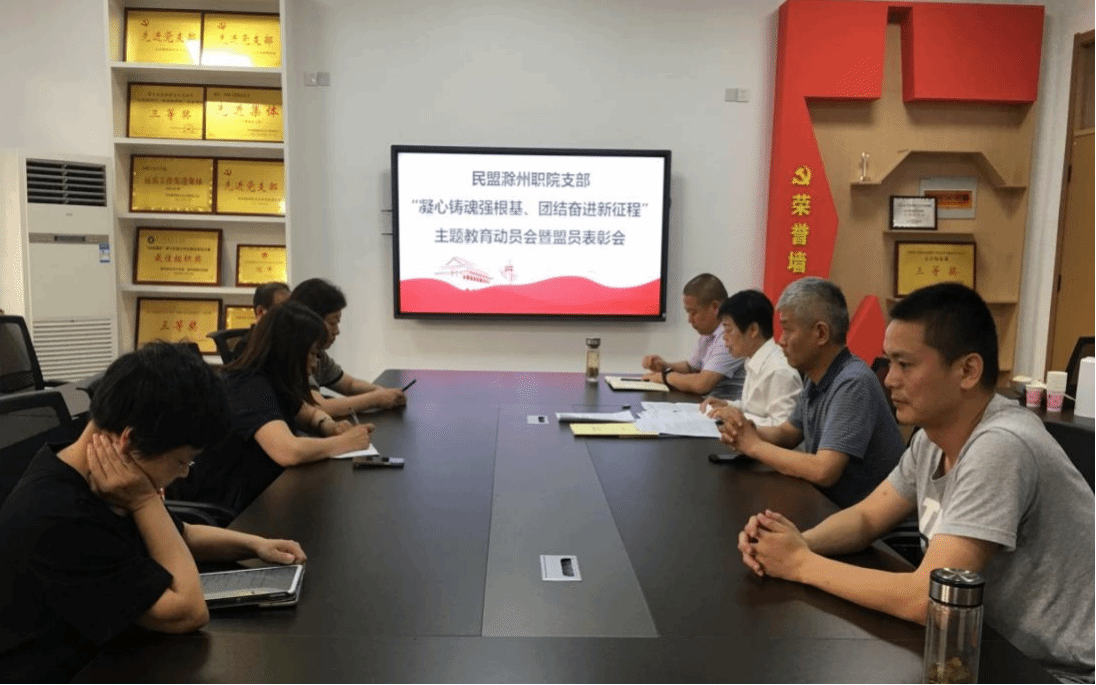 6月14日下午,民盟awc777万象城娱乐官网支部(简称“民盟滁州职院支部”)在awc官网传媒与设计学院会议室召开“凝心铸魂强根基、团结奋进新征程”主题教育动员会暨盟员表彰会。会议由民盟滁州职院支部主委陶会平主持,支部全体盟员参加了此次会议。