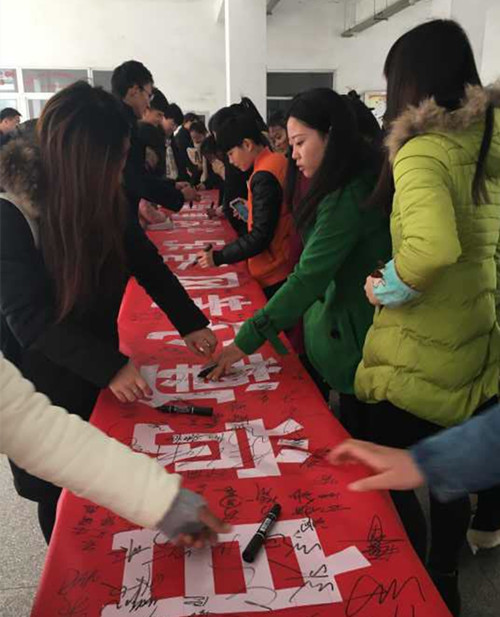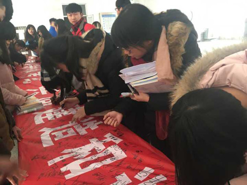 活动过程中广大同学都积极参与,在横幅上签上自己的名字。同学们在大大的横幅上签满了名字,保证在考试中必定做到自觉遵守考风,考纪,承诺以诚信对待每一场考试,考出真实水平。