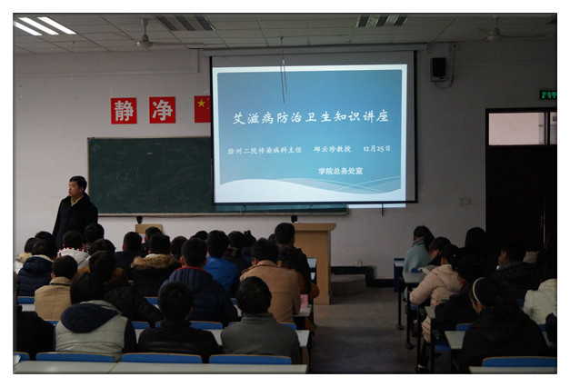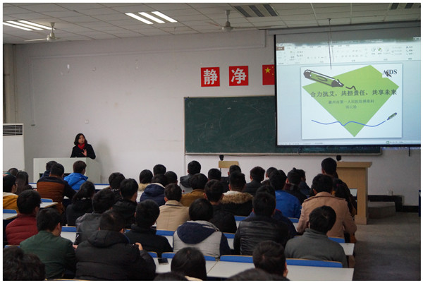为提高学生卫生防疫意识,树立健康生活学习理念,2015年11月25日下午,滁州二院传染病科主任邱云珍老师应邀为在校学生举办了艾滋病防治卫生知识讲座。