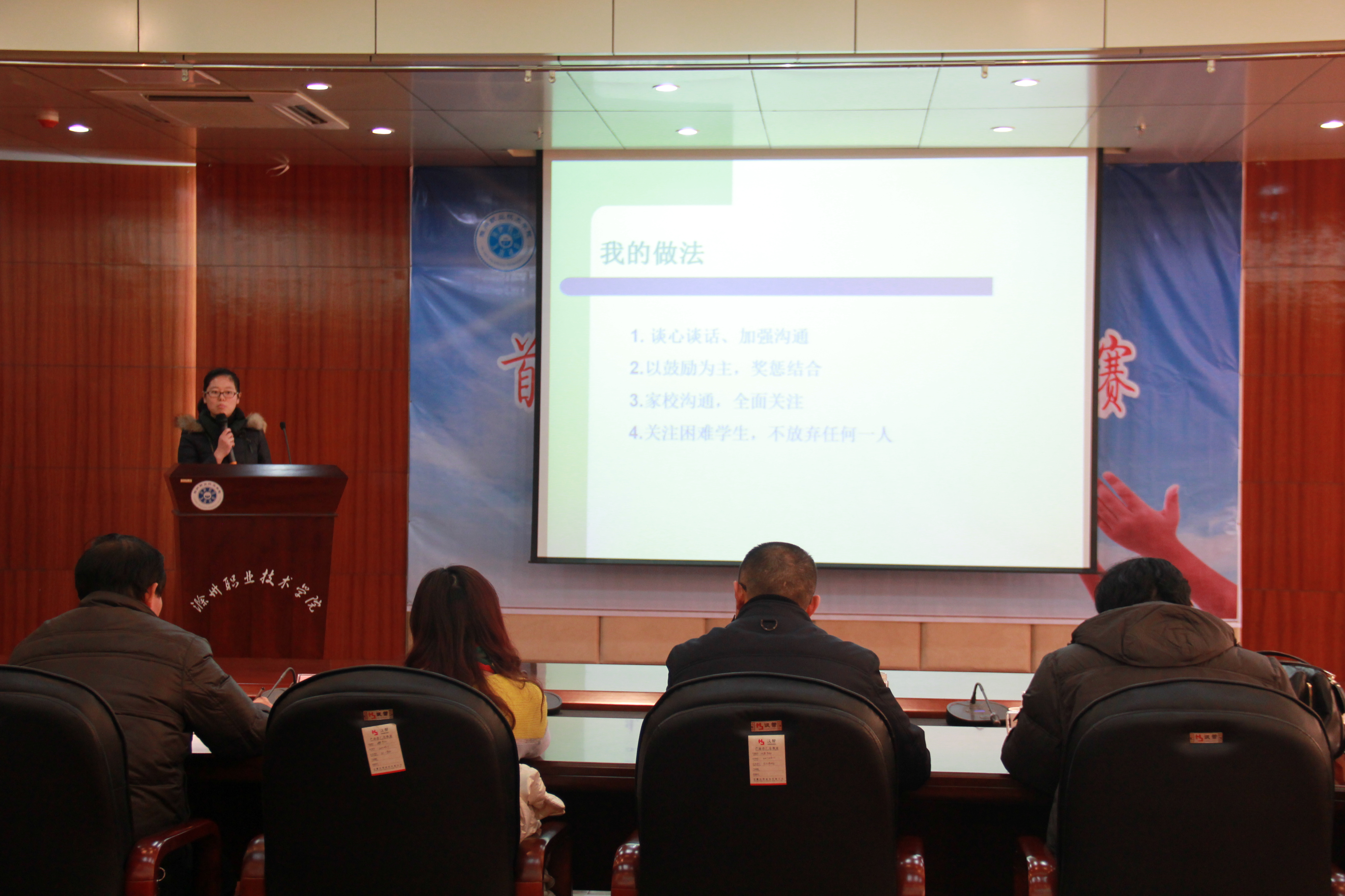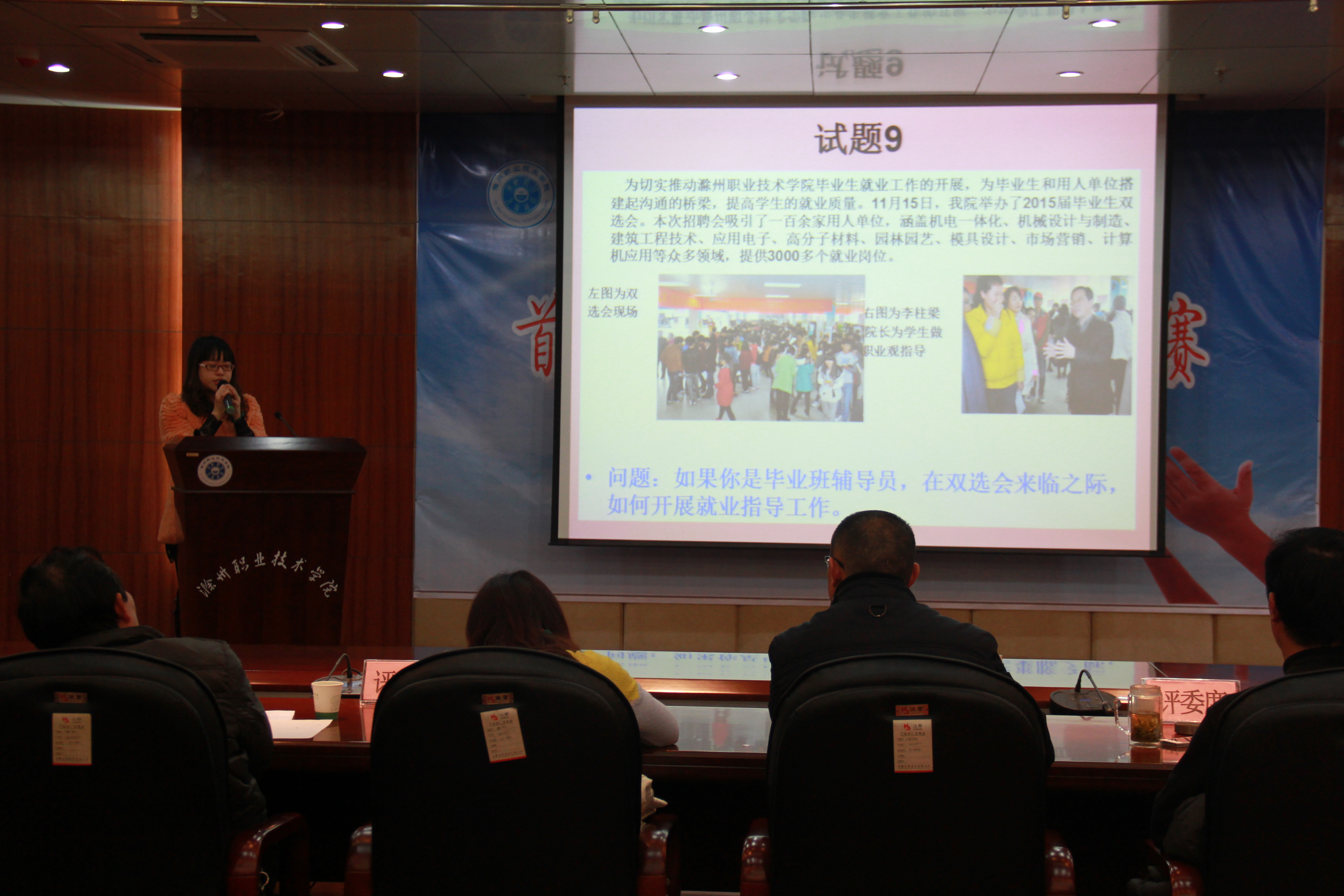 为促进辅导员熟练掌握基本工作技能,不断提升业务素质和工作水平,充分展示辅导员队伍朝气蓬勃、奋发向上的精神风貌,awc777万象城娱乐官网于12月8至9日举办了首届辅导员职业技能比赛。党委书记张勇、院长李柱梁、副院长汪上、院长助理刘宏亲临比赛现场指导比赛。组织人事处、学生处、招生就业处、保卫处、团委、基础部、督导室、职教研究所、图书馆、技师学院等部门负责人担任此次比赛评委。学院全体专职辅导员和部分学生干部观摩比赛。