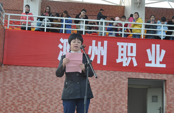 学院副院长江洁致开幕词,代表学院向第十一届田径运动会开幕表示热烈祝贺。江洁指出,我院历来重视体育工作,近年来,学院不断完善体育工作的机构、制度和硬件设施,努力打造高素质、高水平的体育教学师资队伍,积极开展体育教学研究和改革,开展丰富多彩的群众性体育活动,加强运动队的建设、管理和训练,体育工作水平日益提升,取得了丰硕的成果。她强调,举办田径运动会是响应教育部“每天锻炼一小时,健康工作50年,幸福生活一辈子”号召,提高学生体质健康水平的一项重要举措,也是展示我院体育教学改革成果的重要平台。她希望全体运动员发扬“更快、更高、更强”的奥运精神,遵守比赛规则,尊重竞争对手,尊重裁判判定,在比赛中赛出风格、赛出水平,展示出我们滁州职院人的风采。