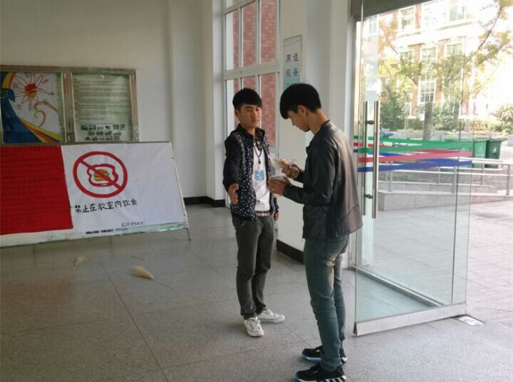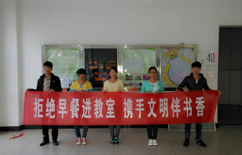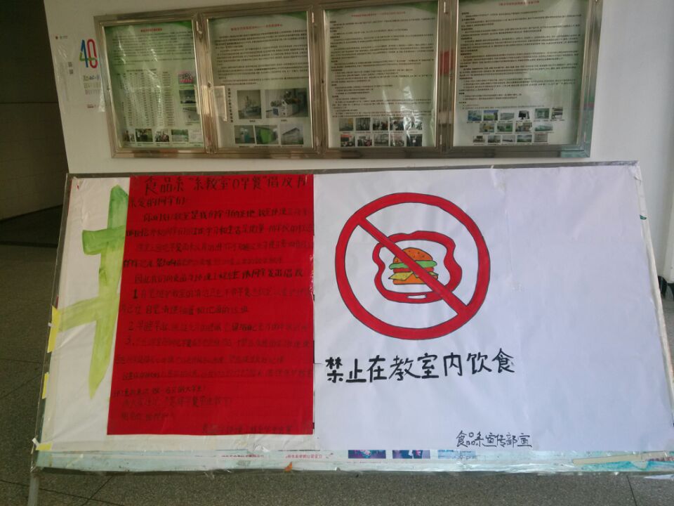 天气渐冷,学生带早餐进教室的现象有日渐增多的趋势,这不仅影响了老师正常的教学秩序,也使得教室卫生状况变差。为在全系营造良好的育人环境,食品系学生会于11月至12月在全系开展“教室0早餐”集中整治行动。