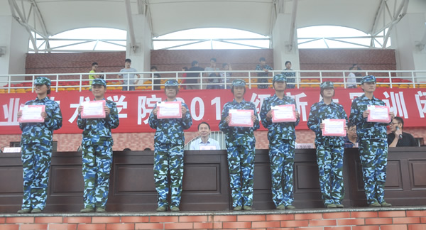 在副院长程一斌现场宣读本次军训表彰文件后,学院领导和承训部队领导向受到表彰的先进集体和个人进行了颁奖。