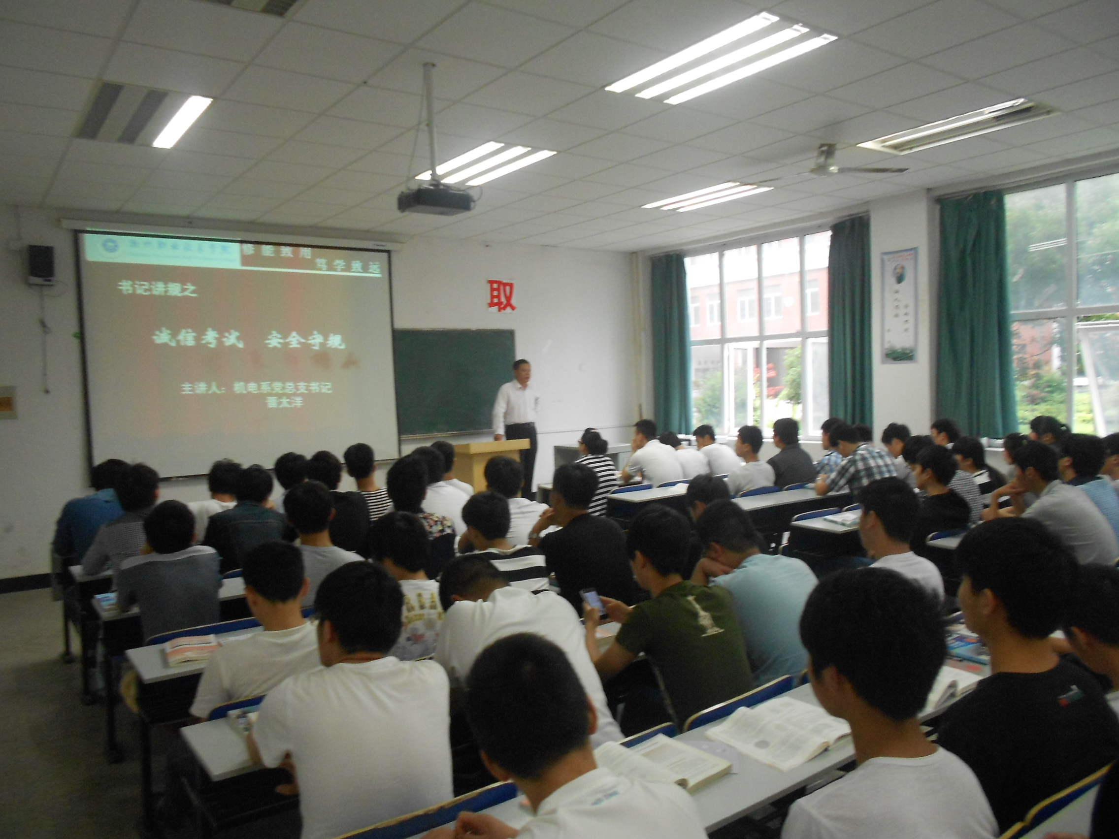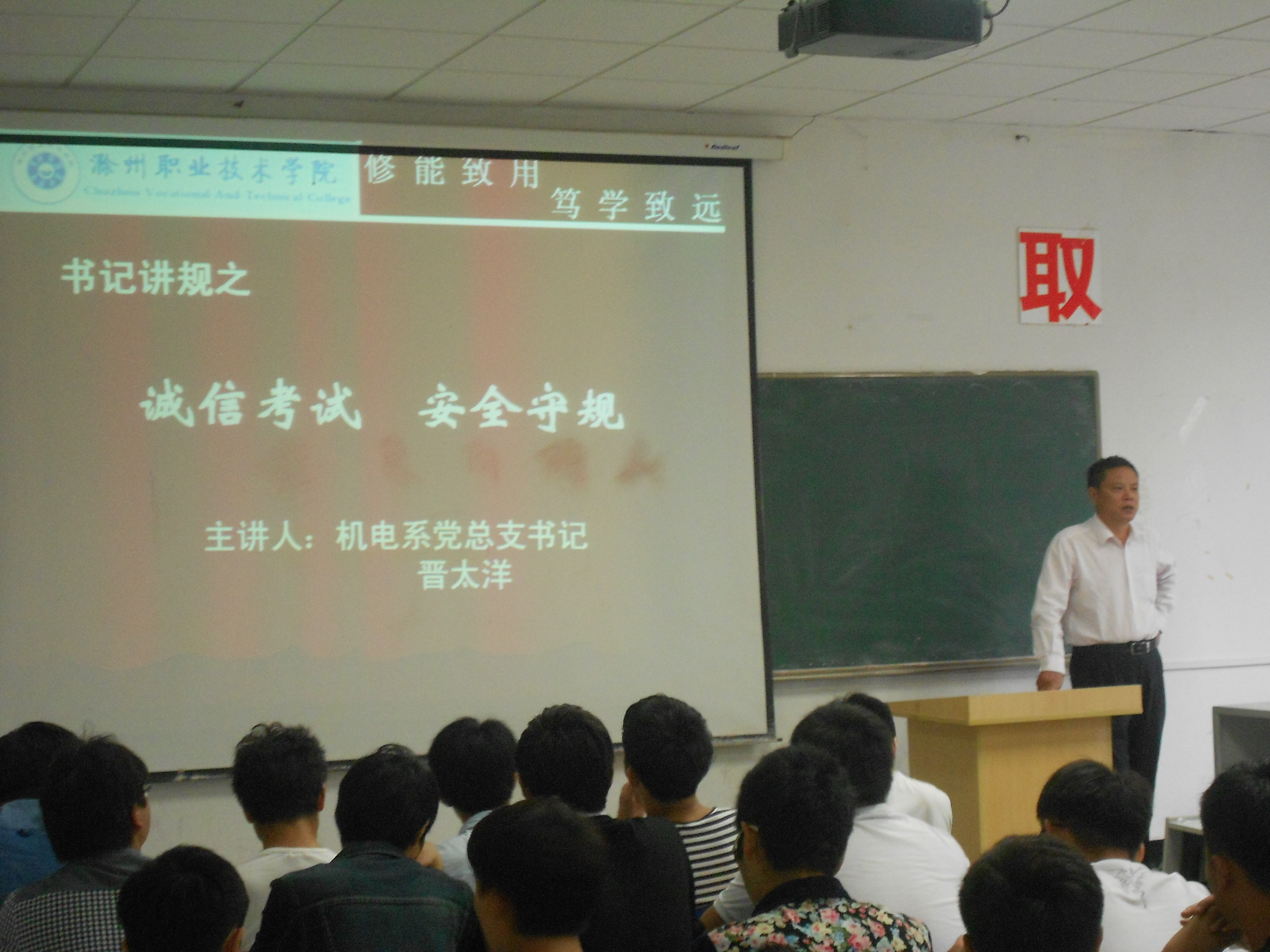 期末考试临近,同学们都在快马加鞭的复习。为了改良考试风气,加强暑假期间同学们的人身安全,机电系于2014年6月17日上午9点50在5013教室展开了一次书记讲规之“诚信考试,安全首规”的主题讲座。此次讲座由我系党总支书记晋太洋为同学们讲演。