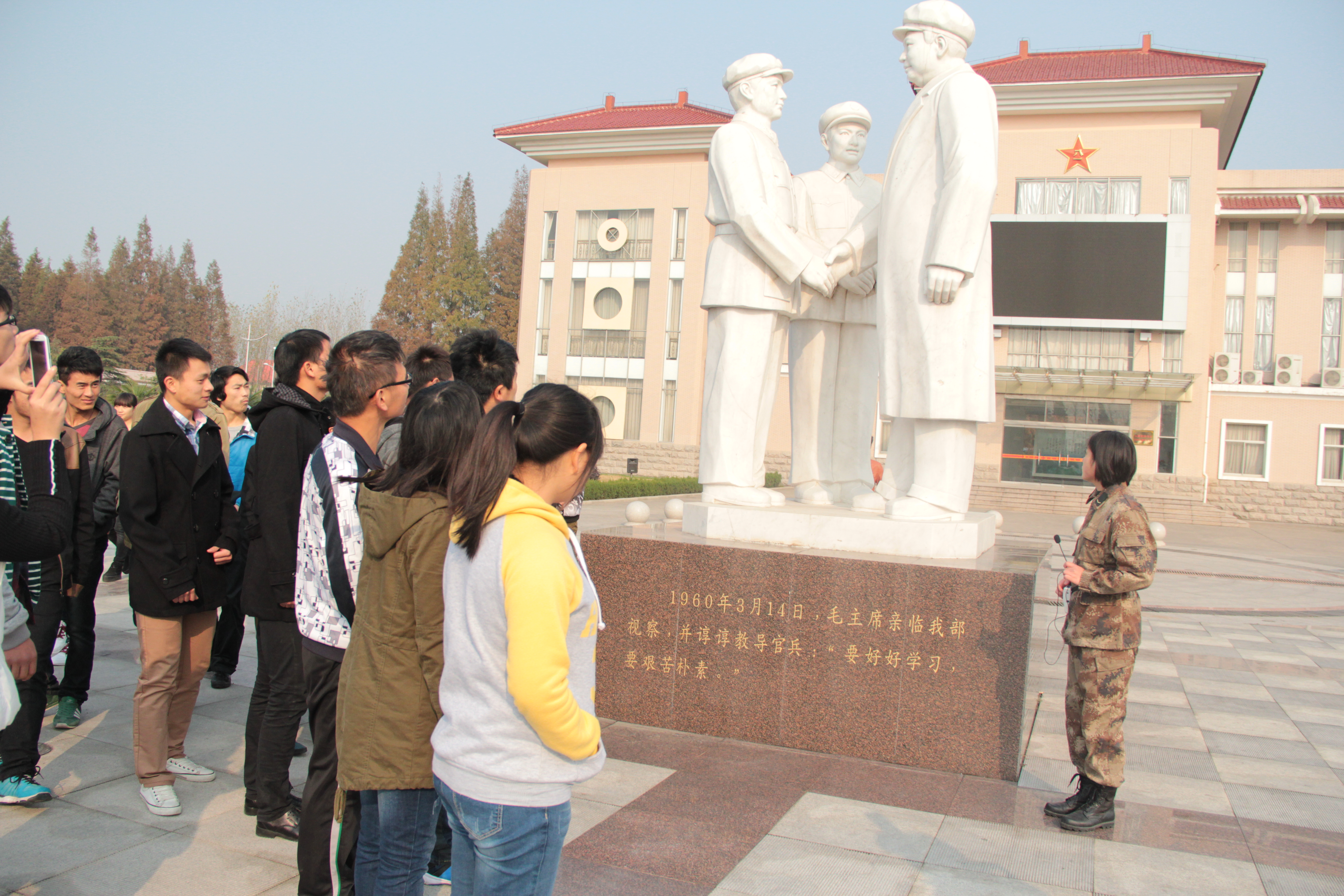 一到营房,学院师生便受到了部队政治部副主任杨模传、秘群办干事周宇峰等部队官兵的热情接待,并指派战士为师生们当起了“导游”。在“导游”的带领下,师生们怀着敬仰之情,观看了军旅纪录片,参观了旅史广场、士兵宿舍等。在此过程中,该部爱党、爱国、爱民、为民、扶民的光荣历史,艰苦奋斗、北征南战、发展壮大的光辉历程及感人事迹,丰富而珍贵的历史图物、清幽的环境,还有人民子弟兵保家卫国、不畏牺牲的坚强信念和英勇顽强的作战精神给大家带来了强烈的震撼。
