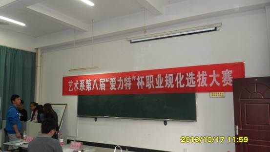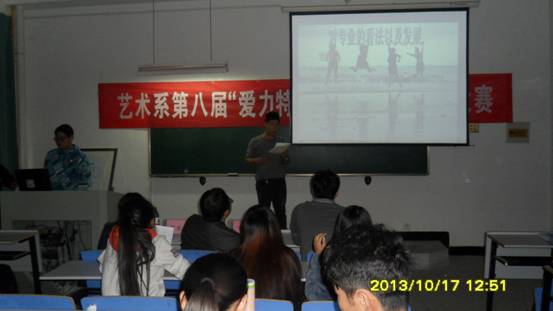 为帮助学生更好地树立职业目标,增强学习动力,2013年10月17日,艺术设计系在艺术楼102室举办了由艺术系各班学生参加的第八届“爱力特”杯大学生职业发展规划大赛。此次活动由艺术设计系辅导员和学生会指导老师对参赛学生进行评分。