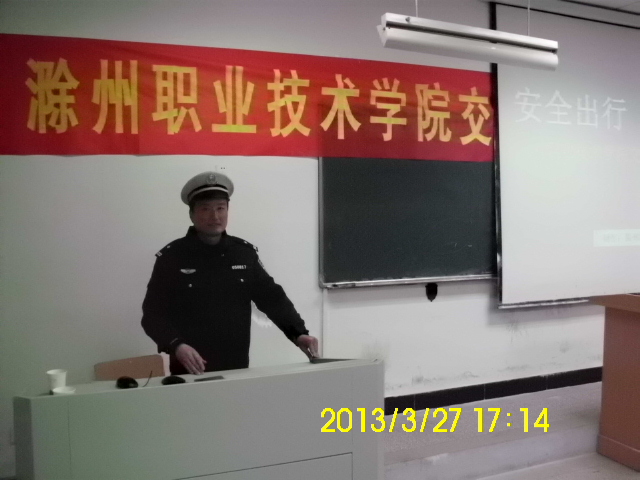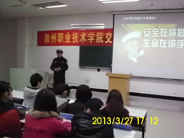 3月27日,滁州市交警支队二大队郑涛指导员应邀来院做交通安全法制讲座,经贸系200余名师生参加了讲座。郑指导员在讲座中列举了大学生在交通出行中发生的交通事故案例,用视频、图像的形式给同学们分析发生交通安全事故的原因和如何预防交通安全事故的发生等,教育同学们要遵守交通规则,提高交通安全意识,珍爱生命,共创和谐幸福家园。