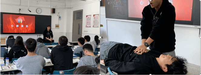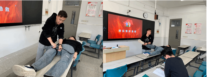 活动现场,土木工程221班退役军人杜鑫同学运用在部队里学习的医学知识,理论联系实际,给同学详细讲解了徒手心肺复苏、骨折创伤救护知识。随后,杜鑫和土木班团支书杨轩东现场示范急救流程,生动形象地讲授了心肺复苏:“一看、二判、三扫视、四呼、五定、六压胸、七开、八吹、九检查”的相关要领。随后,杜鑫同学介绍了常规骨折的急救处理方法,重点说明了开放性骨折和闭合性骨折判断以及处理上的着关键点,演示了旋压式止血带的使用方法。