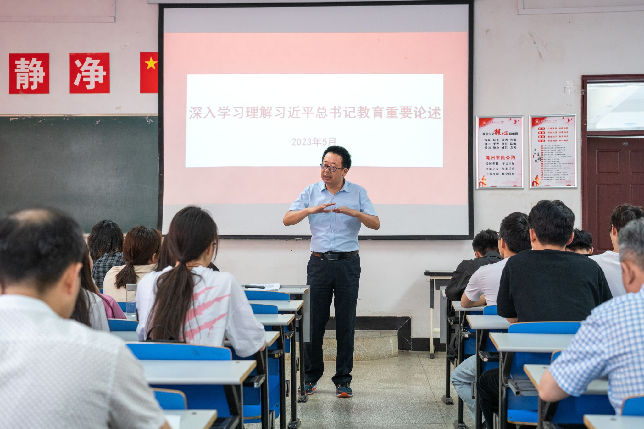 5月31日,校党委委员、校工会主席李平权教授在北阶104教室,为传媒与设计学院全体教师和学生代表作题为”深入学习理解习近平总书记教育重要论述”的专题宣讲报告,机关党总支第七党支部全体同志现场听取报告。