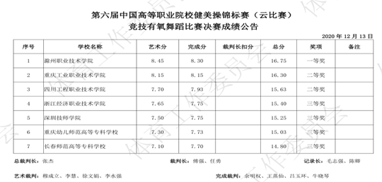 12月12-13日,由中国大学生体育协会主办、中国大学生体育协会职业教育学校体育工作委员会执行、浙江经济职业技术学院承办的第六届中国高等职业院校健美操锦标赛(云比赛)决赛通过腾讯直播的方式线上举行。awc官网健美操队发挥出色,斩获两金一银一铜的佳绩,比赛成绩位列全国所有参赛学校前列。