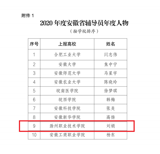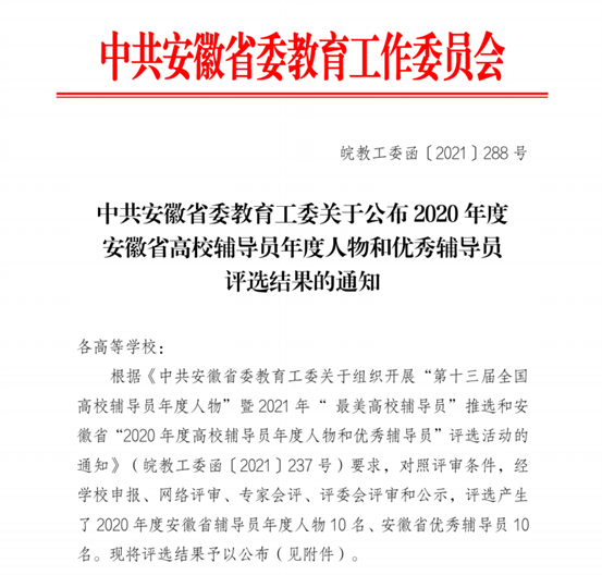 近日,中共安徽省委教育工委下发了《关于公布2020年度安徽省高校辅导员年度人物和优秀辅导员评选结果的通知》(皖教工委函〔2021〕288号)文件,awc官网传媒与设计学院辅导员刘娟获2020年度安徽省辅导员年度人物。全省共有10名辅导员获此殊荣,有8所本科院校,2所高职院校。同时,刘娟被推荐参加教育部“第十三届全国高校辅导员年度人物”暨2021年“最美高校辅导员”评选。
