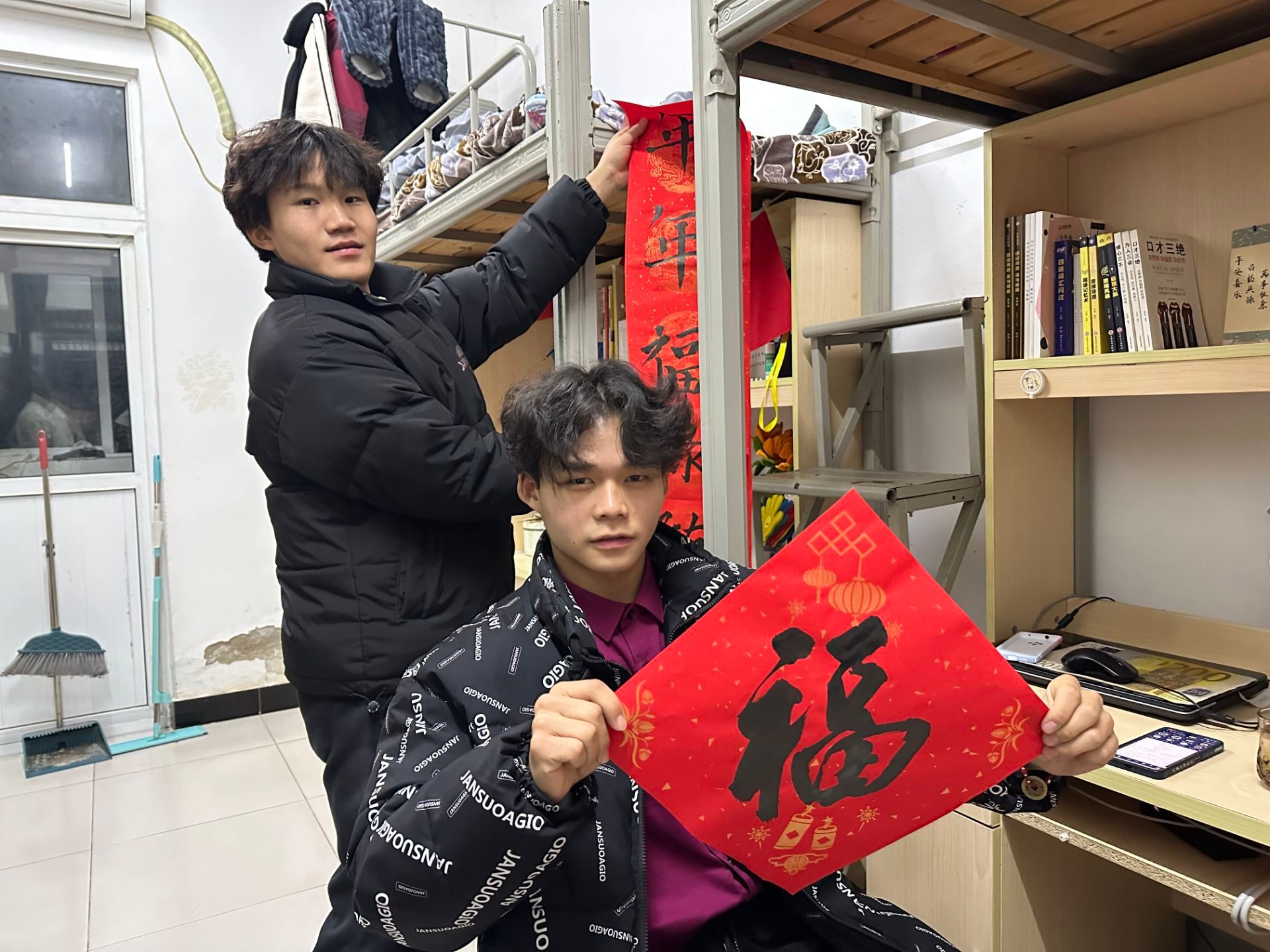 1月4日下午,在机汽学院学生会办公室,学生党员们热情洋溢,他们挥毫泼墨,书写着饱含祝福的春联。每一笔、每一划都流露出对美好生活的期许和对传统文化的热爱。学生会干部把春联送进宿舍,这些春联不仅是对传统文化的传承,更是对同学们深深的关怀与祝福。