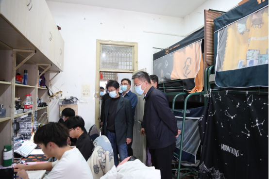 随后,曹付忠一行又先后来到商学院、管理学院、传媒与设计学院学生寝室,通过走访详细了解了学校线上教学开展情况,认真听取同学们对学校线上课程教学质量、封控期间学习生活情况的意见建议。