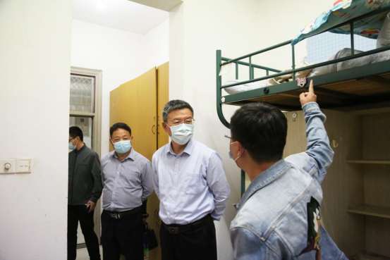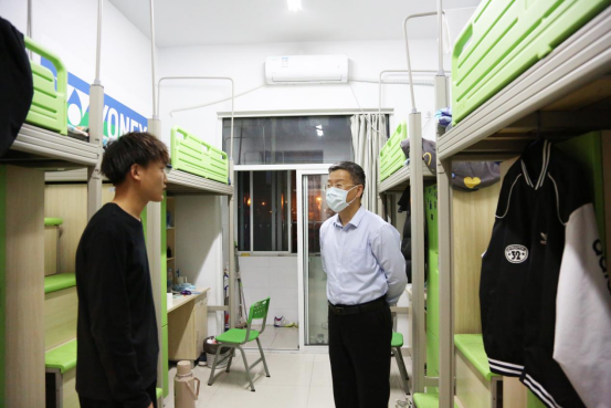 走访中,校领导们与值班辅导员亲切交谈,详细了解了疫情防控期间辅导员开展的学生思想教育、健康状况摸排、心理咨询辅导等工作情况。曹付忠强调,要继续深入加强对学生的教育和引导,进一步密切师生关系,对重点关注学生要加强与学生本人及家长的沟通,适时做好心理疏导,耐心安抚学生情绪,帮助学生解决实际困难。各学院在遵守疫情防控要求的前提下多开展丰富多彩的文体活动,充实同学们的校园生活,让学生用积极乐观的心情面对校内生活。要深入学生宿舍进行安全检查,及时排除安全隐患,确保学生人身安全。要畅通校内的各层级的咨询监督服务热线,主动、及时回应学生关切,继续坚持每日下沉督查,落实落细防控措施,筑牢疫情防控防线。许雪峰要求,要将走访中倾听到的学生的合理诉求反馈至相关部门予以解决,要强化人文关怀,做好疏导和答疑工作,及时解决同学们学习、生活等方面的困难,让学生感受到爱与温暖,同时要切实保障宿舍安全,确保学生安全稳定。