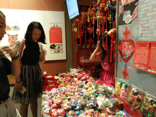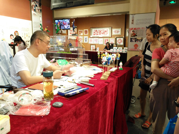这次活动参观了苏州折扇、苏州发秀、扬州漆器、南京剪纸、徐州香包、南京金箔、苏州青铜制作技艺、苏州紫檀雕刻、无锡泥塑和毛笔制作工艺等等。这些昔日难得一见的非物质文化遗产在这里齐聚一堂,给我们留下了深刻映像。这些具有非物质文化遗产制作手艺的人,利用自己的制作工具和手艺技能,来制作一些小礼物,来往的游客如果喜欢便可以买上几个作为纪念带回家。