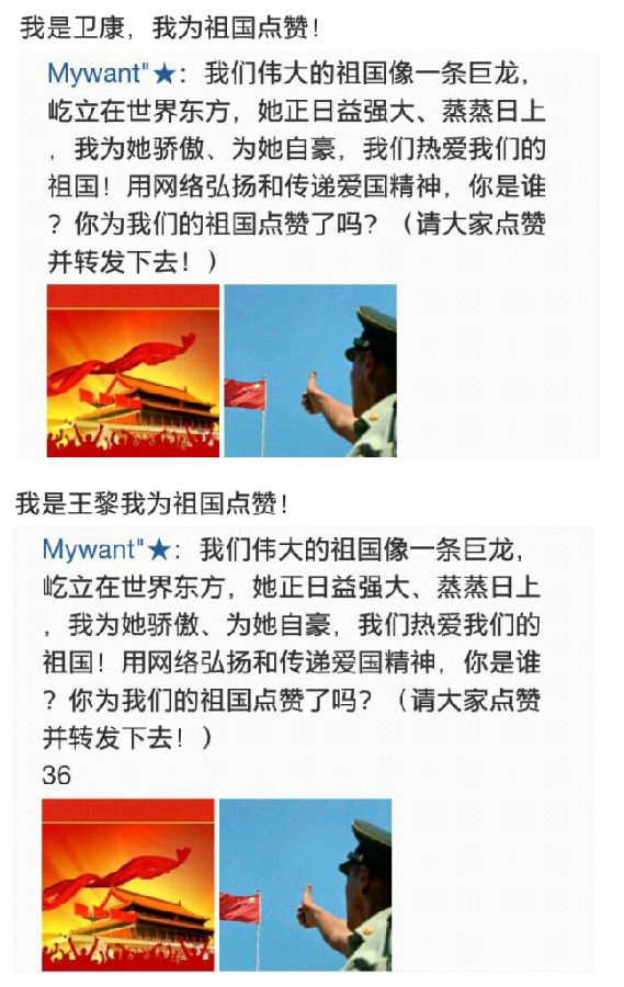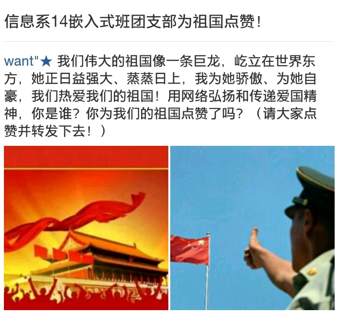 纵观此次活动,旨在通过“网络平台”这个无处不在的、有着广泛影响力的传播载体,去赞扬祖国的繁荣昌盛。同时也能够提高大学生对祖国现今的认知、将爱国热情深入人心。