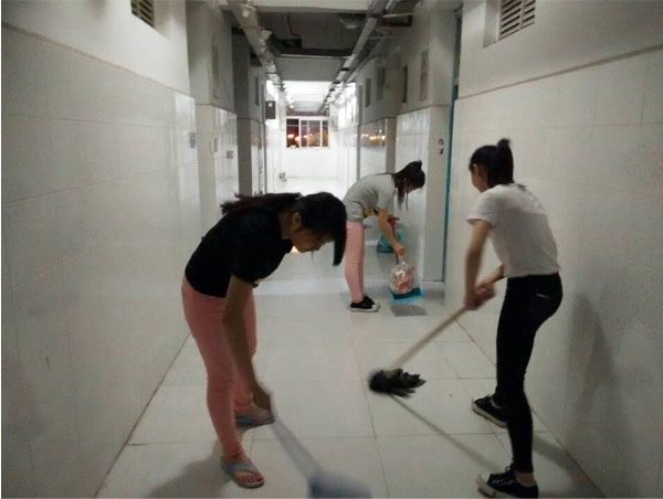 在经过简单的任务分配后,男生负责打扫2号教学楼五楼走廊卫生,女生前去打扫女生宿舍走廊,同学们积极清理垃圾,不怕脏、不喊累、相互配合,自己的行动为学校增添一份清新,一抹明光。