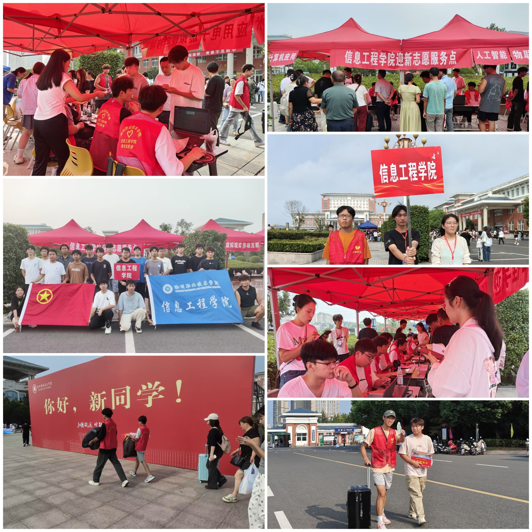 各班级辅导员和迎新志愿者始终坚守在新同学入学登记的第一线。在信息工程学院迎新服务点,辅导员和学生干部为新生办理入学手续,解疑释惑,他们用最大的热情服务班级的新同学们。校园内,身穿红马甲的志愿者们为新生搬运行李,穿梭于人群中,用微笑和讲解传递温暖与期待。他们的身影从校门口延伸至学生公寓,成为校园中一道靓丽的风景线。