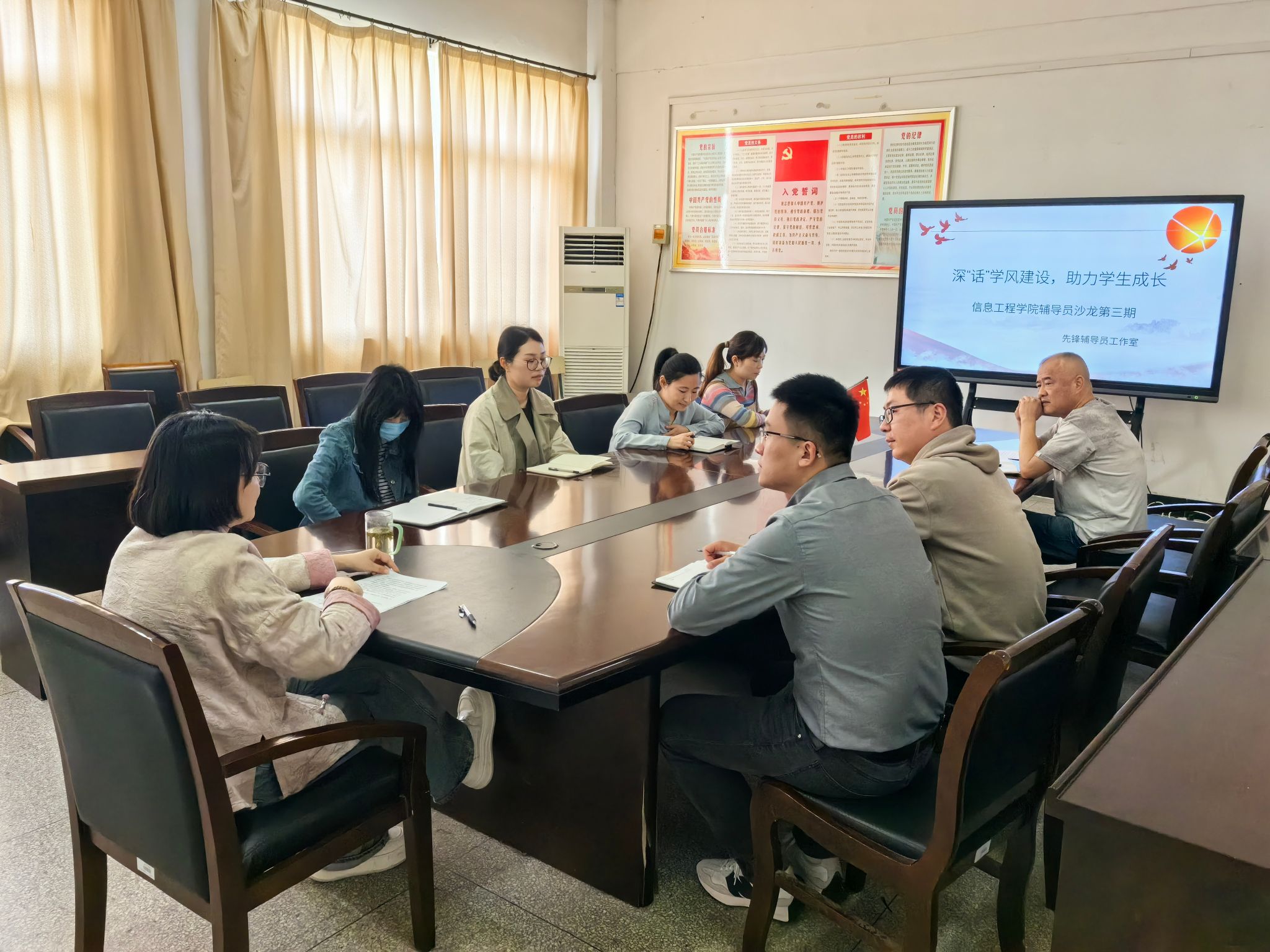 4月26日上午,信息工程学院在致善楼会议室以“深‘话’学风建设,助力学生成长”为主题召开了第三期辅导员工作沙龙。活动由党总支副书记杨阳主持,全体专职辅导员参会。