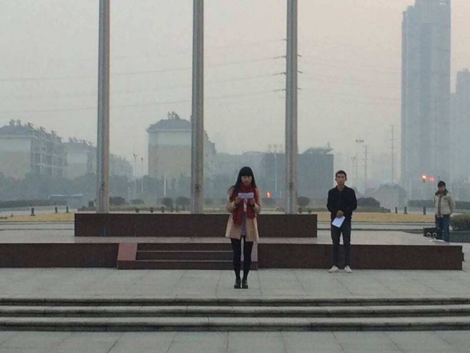 升旗礼毕, 14级嵌入式团支书姚平在国旗下演讲,倡议“光盘行动”。