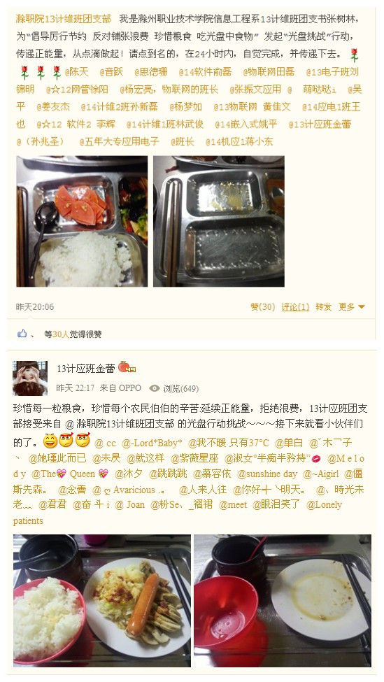 前段时间,一项意在帮助渐冻人的慈善活动"冰桶挑战"在全球风靡后,"点名接力挑战"的活动方式便广为流传。近日,信息工程系13计维班团支部发起以“倡导厉行节约 反对铺张浪费 珍惜粮食 吃光盘中食物” 为宗旨的“光盘挑战”活动。本次活动结合新媒体,利用微博和QQ空间以点名接力的方式开展,不断推动周边同学积极参与。被@同学纷纷晒出了自己的“光盘”。