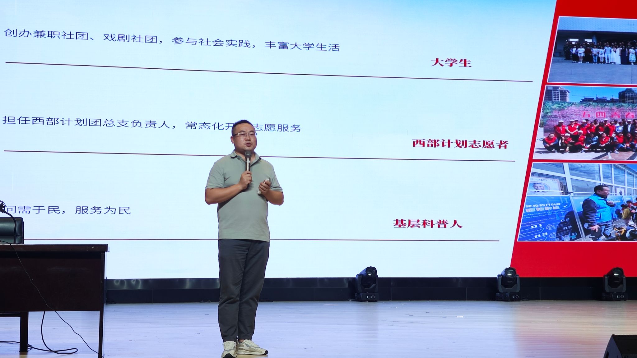 为积极响应团中央“到西部去,到基层去,到祖国和人民最需要的地方去”的号召,广泛动员更多的优秀青年加入西部计划志愿者队伍中,6月11日中午,信息工程学院邀请2015届优秀校友李飞在校大礼堂开展了以“西部志愿行 青春献祖国”为主题的报告会。院党总支副书记杨阳主持,院专职辅导员和2023级学生代表聆听此次报告会。