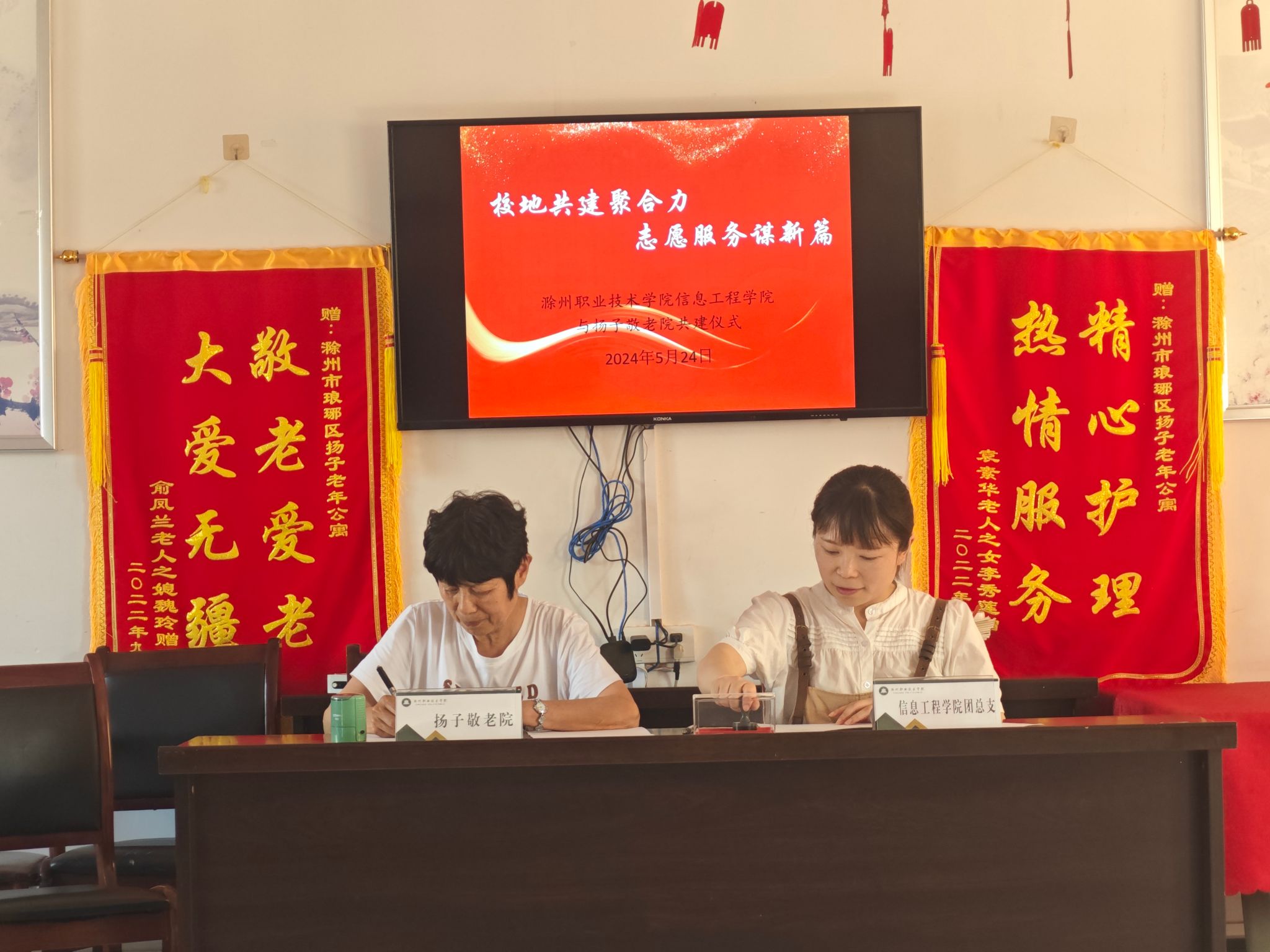为深入学习贯彻党的二十大精神,深化校地共建,弘扬敬老爱老的中华传统美德,5月24日,信息工程学院团总支与扬子敬老院顺利举行志愿服务活动共建签约仪式,我院党总支副书记杨阳、团总支书记朱睿和扬子敬老院院长王延桂出席本次签约仪式。