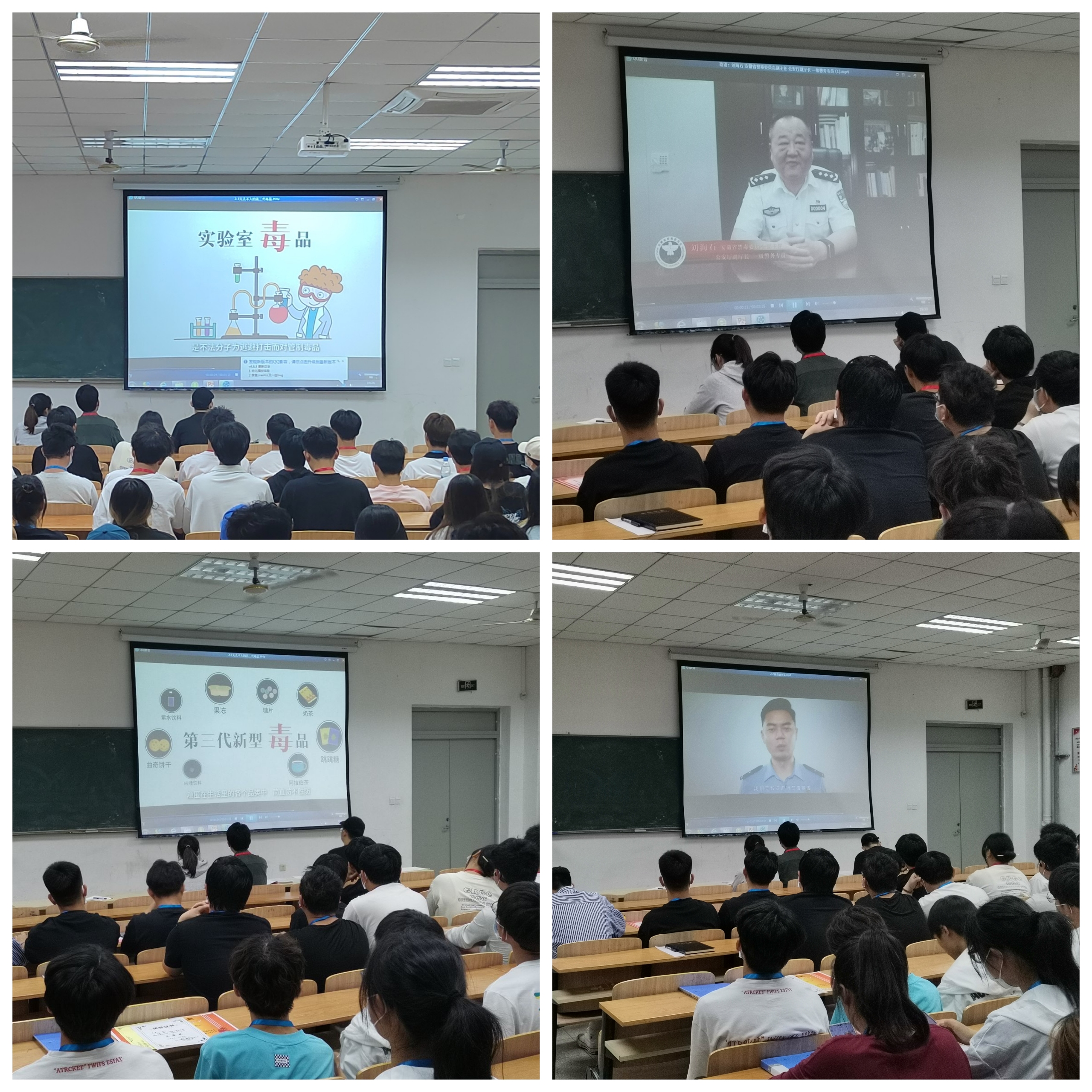 活动中,组织同学们集中观看了禁毒宣传公益短片《青春不是挥霍的筹码》、《别让“我以为”变成“我后悔”》以及省禁毒委、团省委相关负责人致辞寄语等相关视频,通过宣传片向同学们展示了毒品的恐怖与黑暗,了解了毒品的来源、种类和危害,展现了人们在面临毒品问题时的好奇、困惑与艰难。讲述了毒品给个人、家庭、社会所造成的危害,告诫学生要珍爱生命,拒绝毒品,提高自我防护意识,切莫让毒品走入自己的生活。并让学生关注“中国禁毒”和“中国禁毒在线”微信公众账号,更多了解禁毒权威知识,共同创建全国禁毒示范城市。