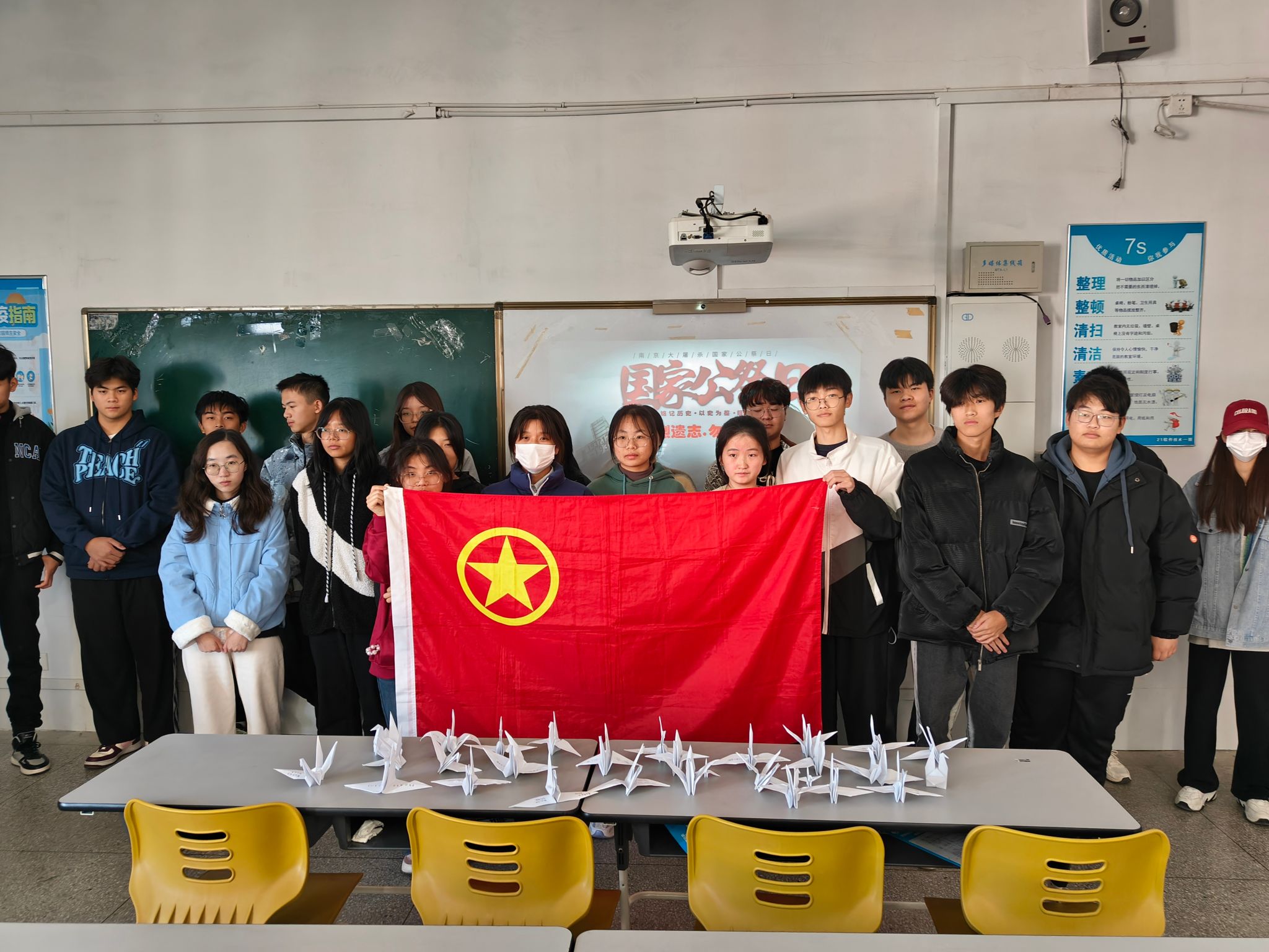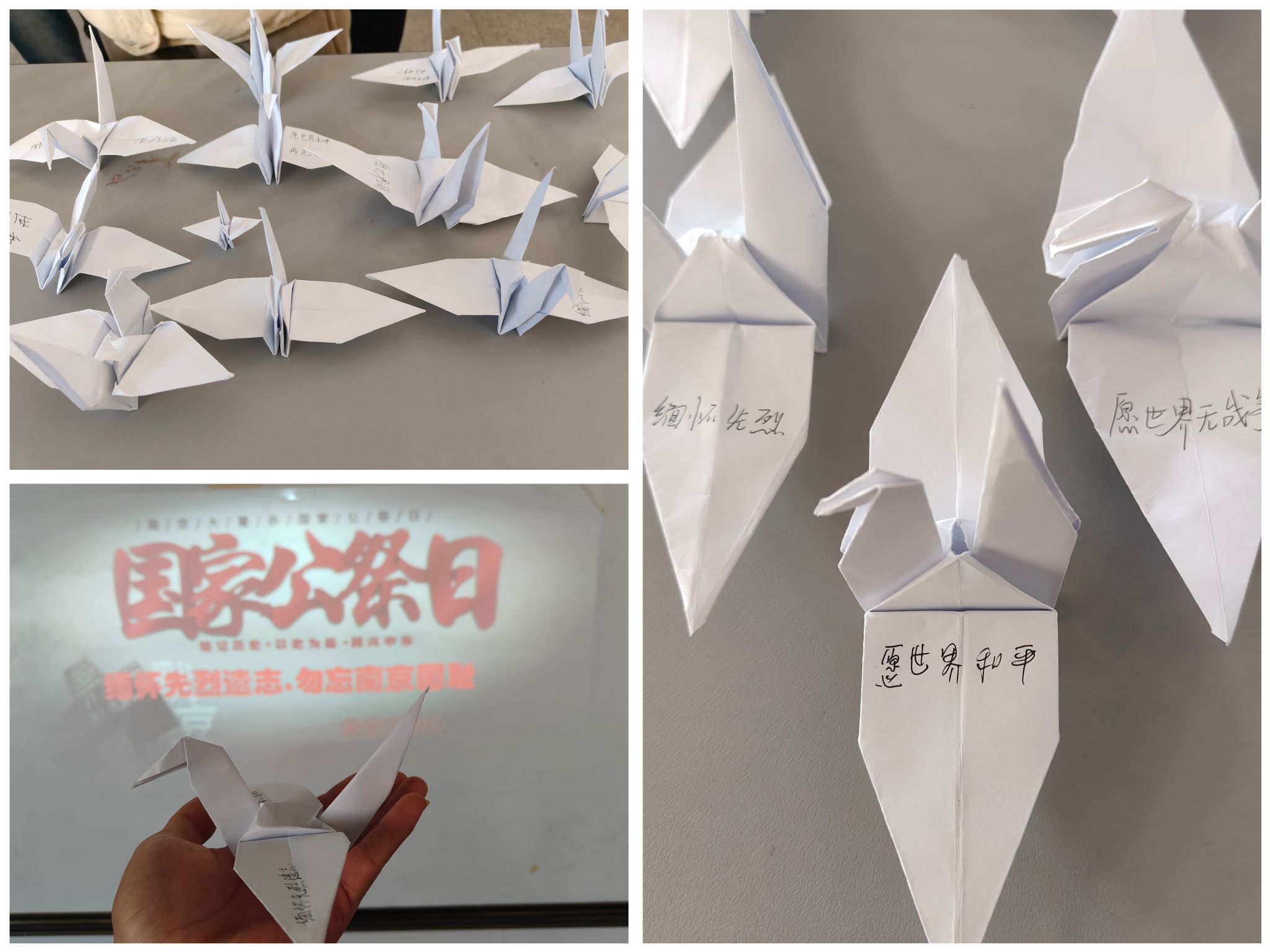 活动中,主持人王奥宇向大家介绍了国家公祭日的历史背景和形成原因,指出国家公祭日是用于追悼、悼念国家重大历史事件中遇难者的日子。随后,王奥宇引领同学们以低头默念的形式,向逝者致以最崇高的敬意。在这一时刻,同学们将沉静身心,内心默默地悼念,表达各自的敬仰与敬意。最后,王奥宇带领同学们一起叠千纸鹤并在其上写下悼念语,以表达对逝者的怀念和祝福,也将这份心意传递给他们的亲人与后人。在这特殊的日子,同学们共同铭记历史、缅怀先烈的庄严时刻,对为国家付出的英雄致以了自己最高的敬意。