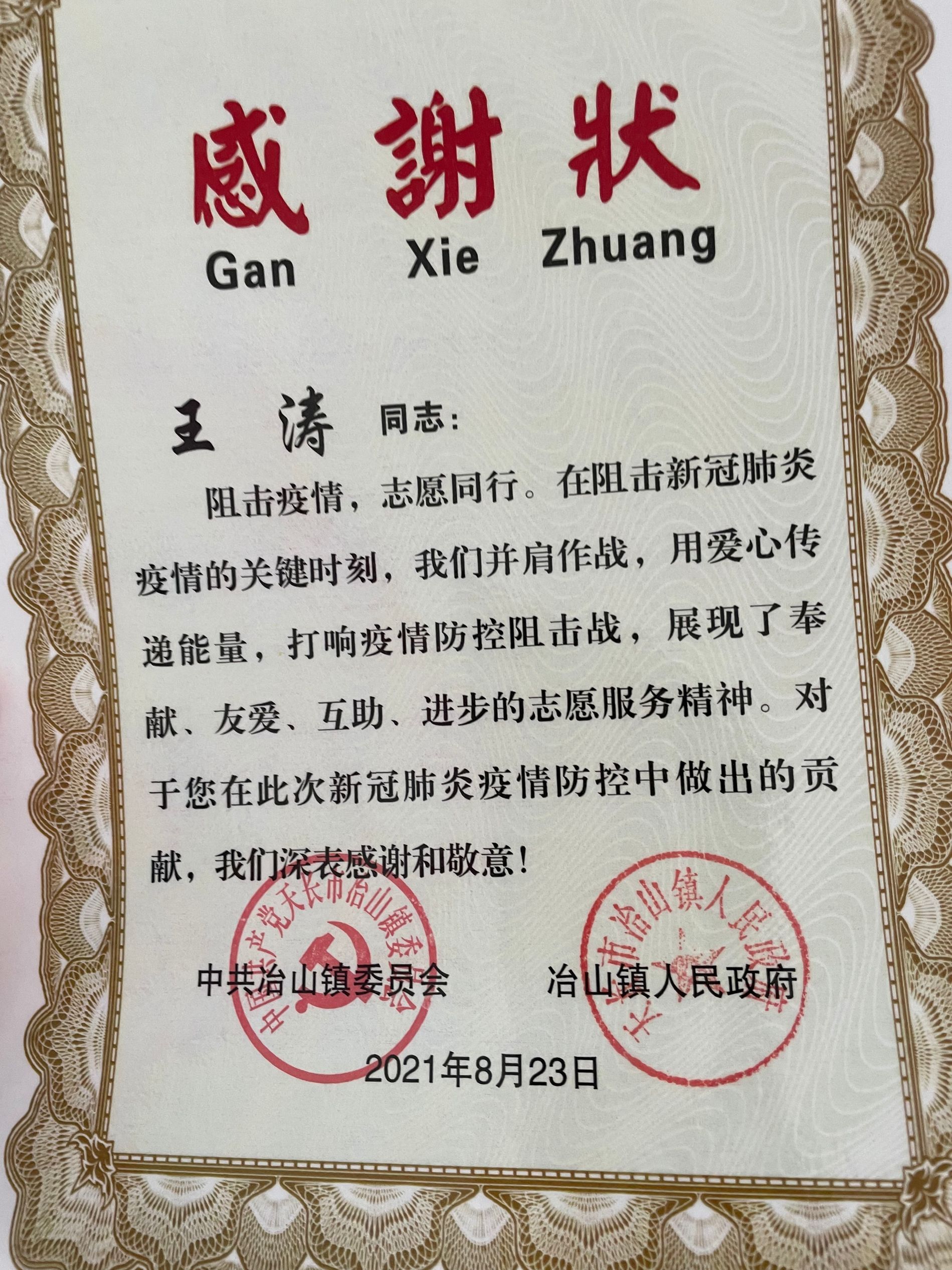 家住滁州天长的20计应王涛同学,因其周边的南京和扬州均出现了聚集性疫情,为抗击疫情,8月2日至20日期间,王涛积极报名参加了社区的疫情防控志愿服务工作,主要负责登记并核实居民信息、提醒来往居民佩戴口罩,向居民宣传疫情防控的知识,提醒群众不要参加聚会、不串门、少出行、出门佩戴口罩,提升群众自我防护意识。志愿服务期间,他克服困难、甘于奉献、吃苦耐劳,为疫情防控做出了青年大学生应有的奉献,也收获了当地政府的感谢状。