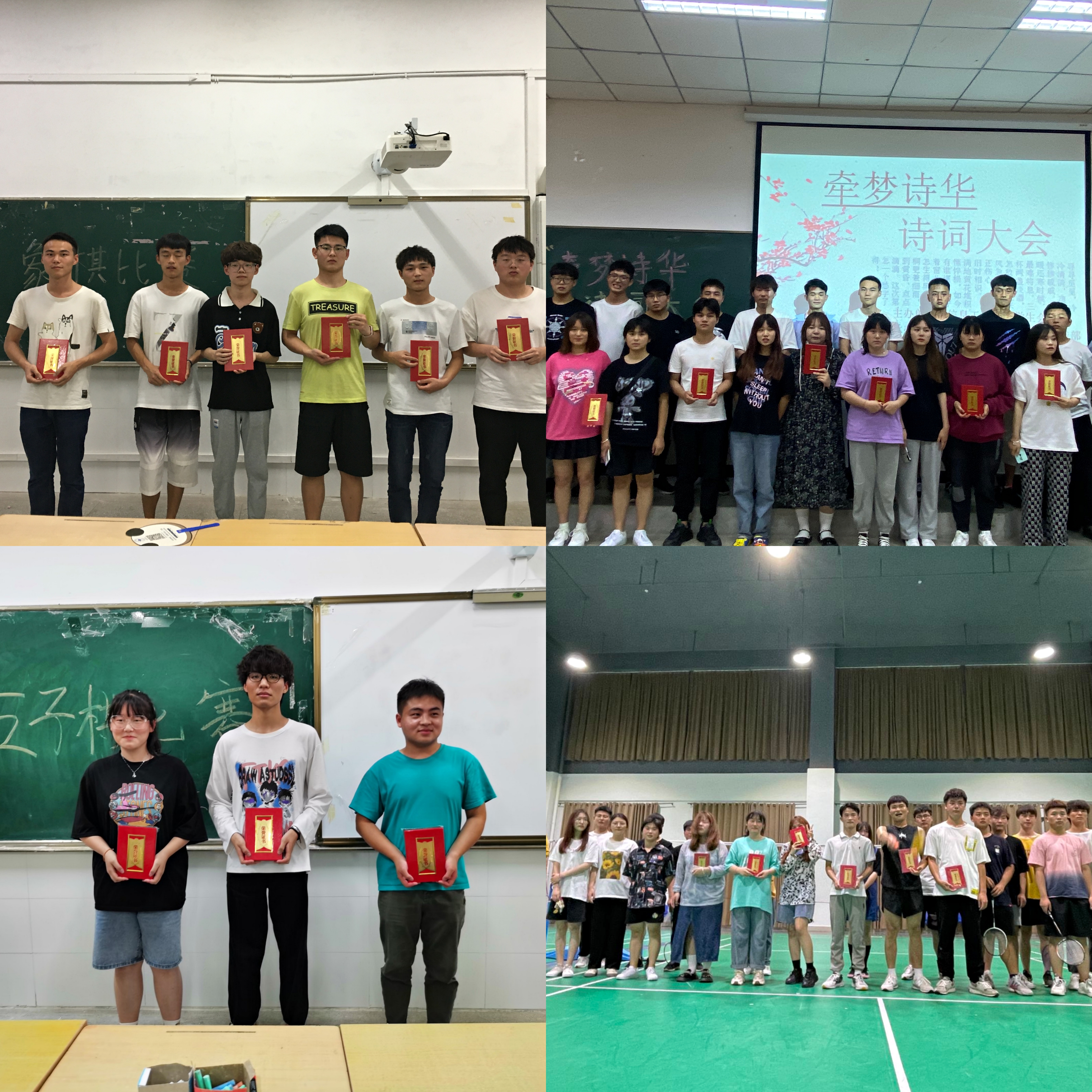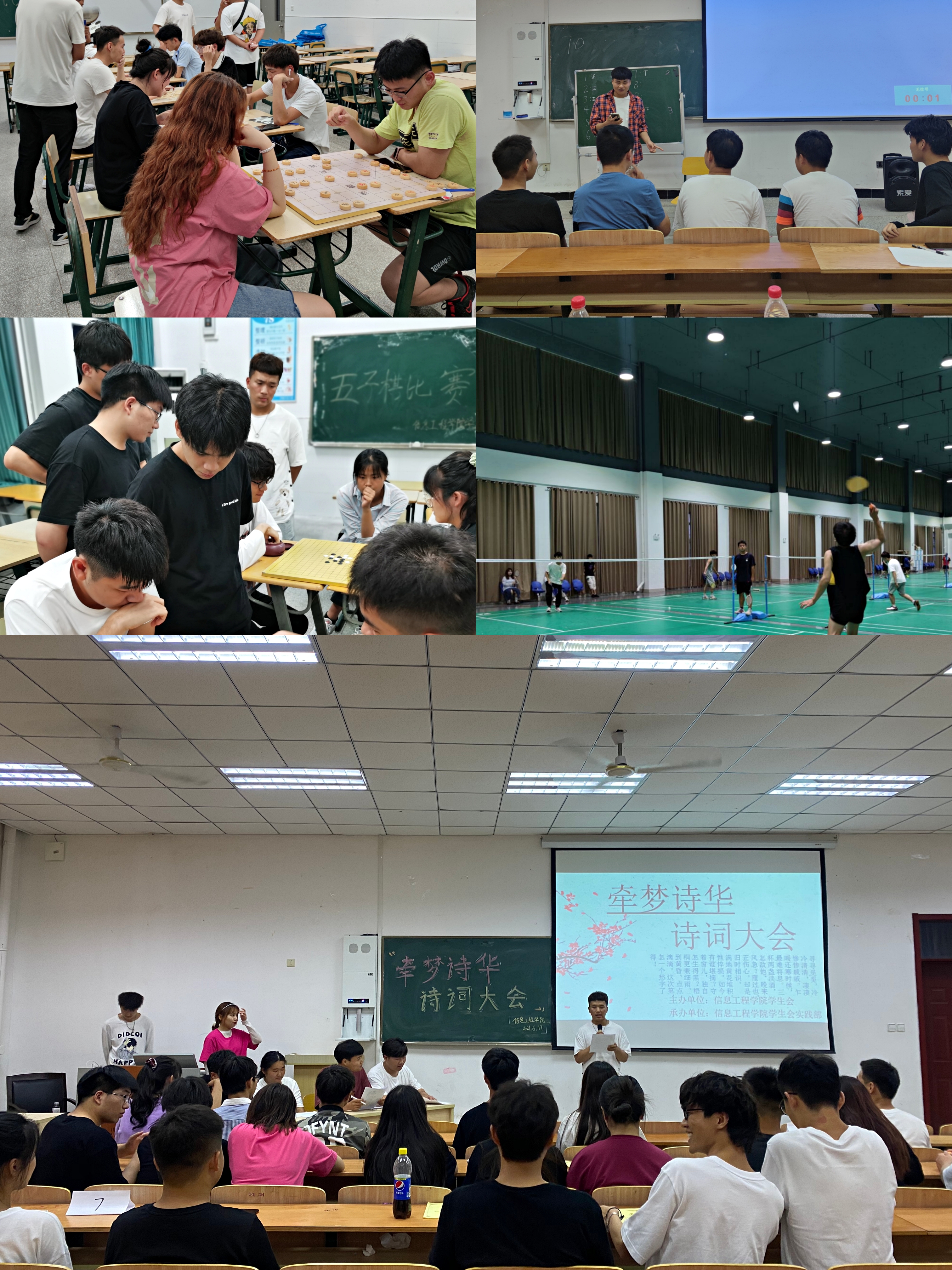 首先是由办公室部举办的“猜歌名”活动。音乐可以陶冶我们的情操,放松心情,不仅以游戏的形式为无聊的周末增添一点乐趣,同时还扩宽同学们在音乐上的知识面,以团队的形式进行,体现同学们的团队协作精神和集体荣誉感。接下来是学习纪律部和生活部分别举办的“象棋”和“五子棋”比赛。比赛现场落子声此起彼伏,选手们的参赛精神、参赛热情、对弈专注度丝毫不输专业赛场的比赛。不仅能增强同学们思维能力,而且富含哲理,有助于修身养性。紧跟着的是体育部举办的羽毛球比赛,每位选手都发扬勇于拼搏,不断进取的精神,展现了大学生的精神面貌。接下来是由实践部举行的“牵梦诗华,诗词大会”,比赛激发大家对诗歌的热爱之情。同时希望通过这次活动增加大家在经典诗歌上的知识储备。最后是由文娱部和宣传部共同举办的撕名牌活动。参与人员斗志昂扬,激情四射,每一个动作无不透射出青春的气息,每个环节无不展示出团结的精神。