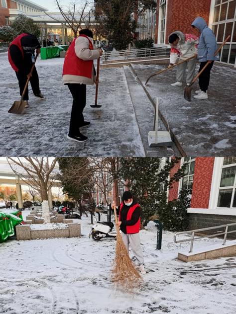 志愿小分队拿着铁锹、扫帚等工具采用“分工配合,轮流作业”的工作模式,不畏寒冷,怀揣着满腔的热情,积极投身于清冰铲雪活动中,着重对致善楼前的主干道和易滑路段进行清扫。火热的劳动场面赢得了路过师生的驻足称赞。