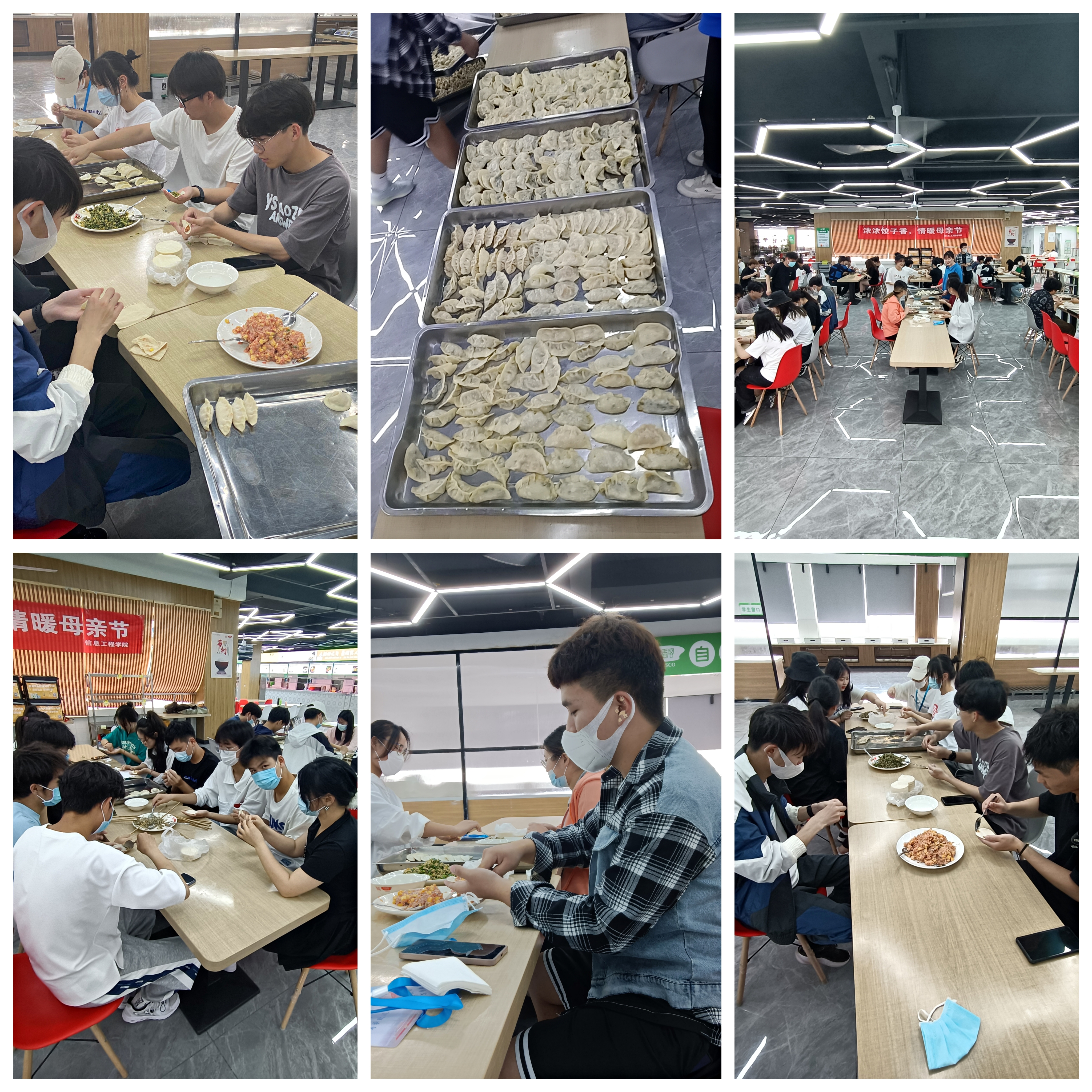 为丰富同学们的课余生活,弘扬中华民族的传统美德,营造浓厚的母亲节节日氛围。5月8日下午,信息工程学院团学组织在食堂三楼开展了“浓浓饺子香,情暖母亲节”主题包饺子活动。