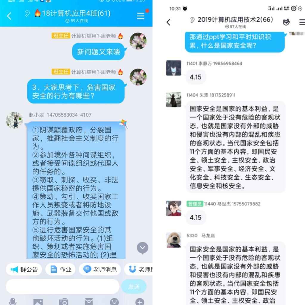 继我院各班辅导员组织学生错峰观看完“千万学生同上一堂国家安全教育课”,为了进一步教育引导广大学生牢固树立国家安全意识,自觉维护国家安全,我院各班级依托QQ群、腾讯会议等网络平台,陆续开展了“国家安全教育”线上特别主题班会活动。