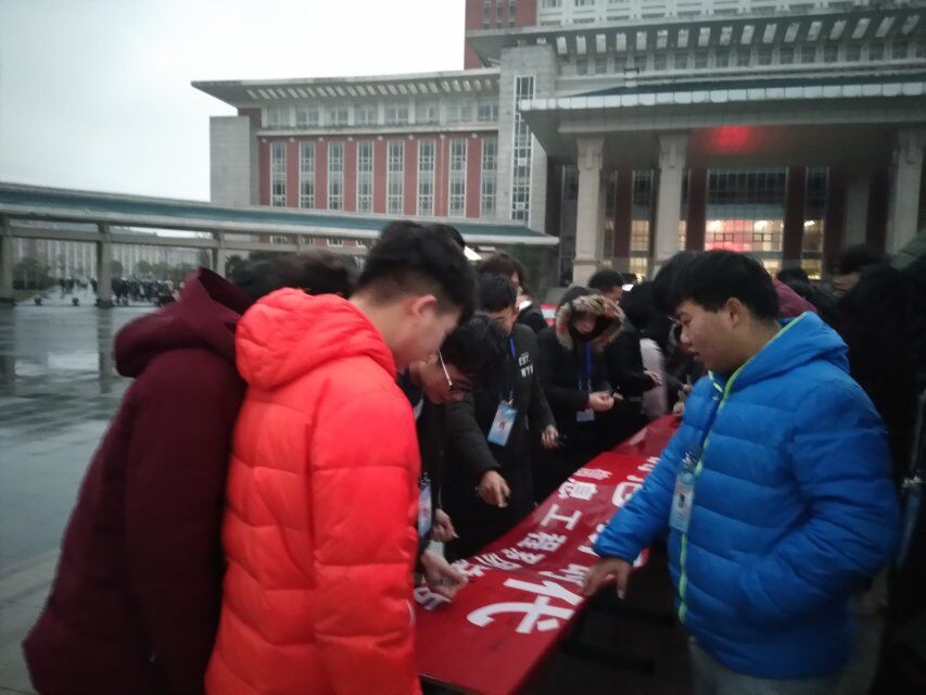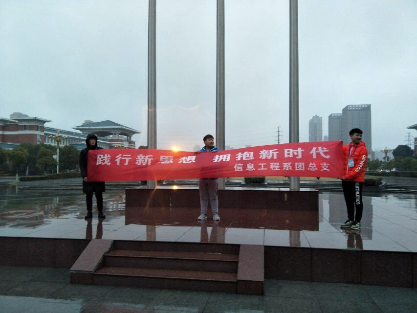 2018年1月3日清晨,天还没亮,awc777万象城娱乐官网综合楼前广场上已经聚集了整齐的队伍,信息工程系团总支和学生会冒着蒙蒙细雨和凌冽的寒风,组织了团员和学干代表举行了“践行新思想 拥抱新时代”主题升旗活动,仪式结束后,同学们陆续在条幅上签名,表达了滁职学子生永远跟党走,青春献祖国的决心。