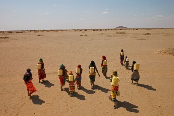 女孩和男孩爬上通往埃塞俄比亚福罗村的陡峭小路。他们每人携带六加仑用来饮用做饭的混浊河水。孩子们每天要往返几趟,每趟需要两到三小时。男孩子长到七八岁时,就不用再做这样的家务事,而女性一生大部分时间都用来搬运水。