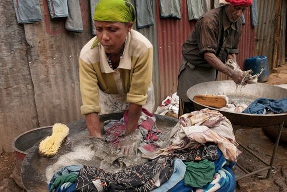 在亚的斯亚贝巴贫民区一个临街洗衣店,欧麦尔用肮脏的水为男人洗衣服,每天挣一美元——只有男人有能力支付洗衣费。