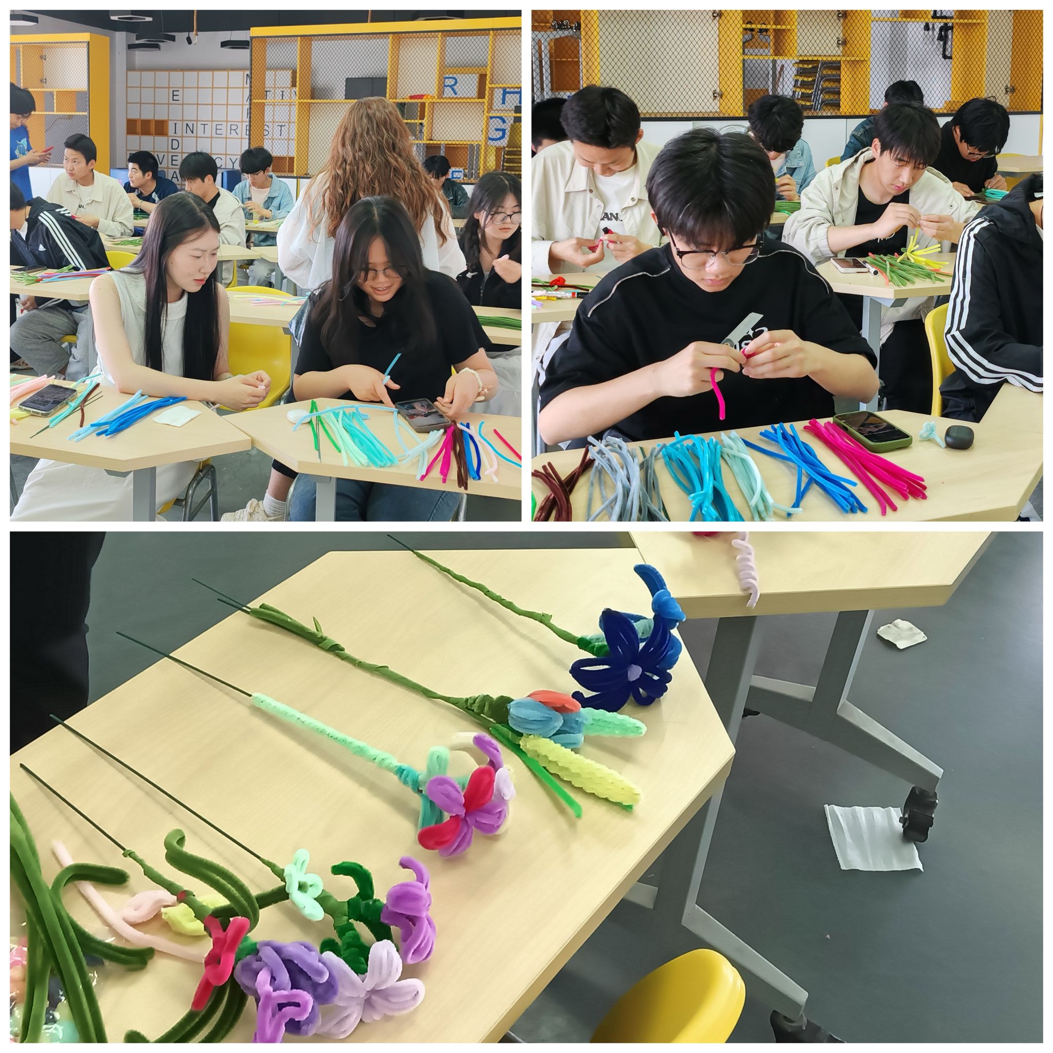 活动现场,材料区摆满了色彩缤纷的扭扭棒、装饰珠等,在观看完制作视频后,同学们充分发挥创意,将一根根普通的扭扭棒弯折、缠绕、组装。有的同学精心设计花朵造型,有的仔细搭配色彩,将对母亲的爱、对女性工作者的感恩融入每一个制作细节。“我想把这束花送给妈妈,虽然不能陪在她身边,但希望这束亲手做的花能让她感受到我的爱。” 参与活动一个同学说道。