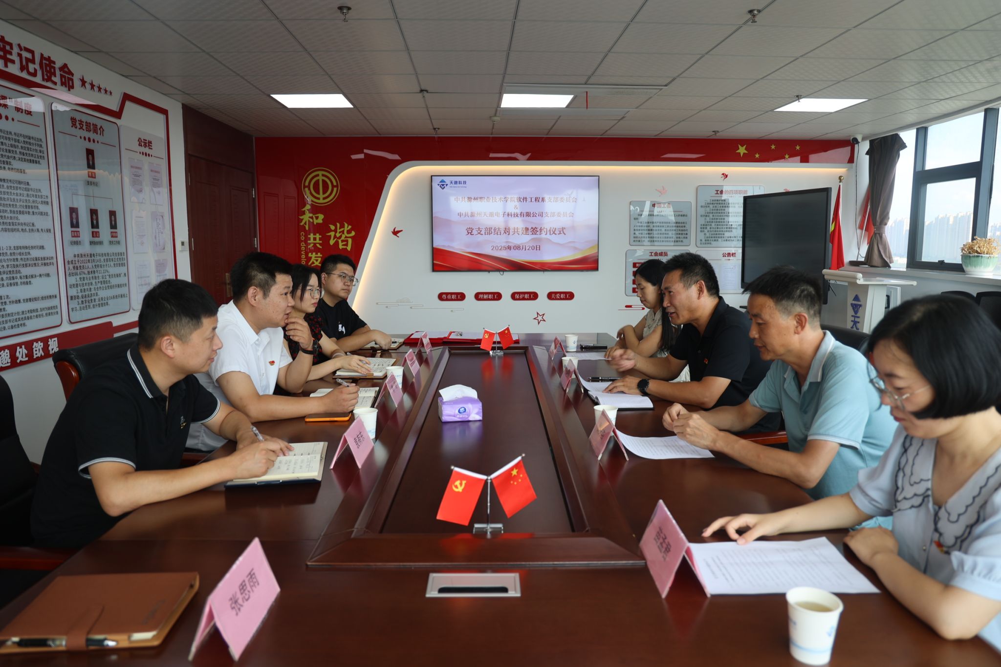 近日,软件工程系党支部与滁州天邈电子科技有限公司党支部举行党建结对共建签约仪式,旨在深入学习贯彻习近平新时代中国特色社会主义思想,落实新时代党建要求,发挥党组织在教育发展与地方经济服务中的引领作用。此次合作以创新党建工作模式为关键,致力于深化校企协同,推动党建与校企发展深度融合,把党组织优势转化为教育提质和服务地方经济的实际成果。签约仪式上,软件工程系党支部书记王善勤和滁州天邈电子科技有限公司党支部书记傅瑶,分别介绍了各自党组织的基本情况与党建工作进展。通过深入交流,双方增进了了解、加深了认识,为后续合作筑牢思想根基。