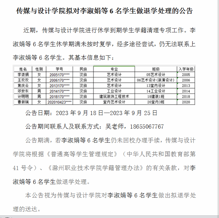 传媒与设计学院拟对李淑娟等6名学生做退学处理的公告