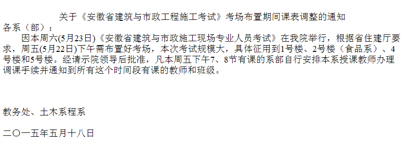 关于《安徽省建筑与市政工程施工考试》考场布置期间课表调整的通知